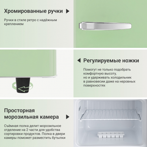 Холодильник RT-152 GREEN прекрасно сочетается с чайником, тостером и термопотом комплектов Elizabeth и Margherita. Приобретённая в дополнение к холодильнику, техника Tesler в ретро-стиле сделает интерьер кухни гармоничным и запоминающимся.