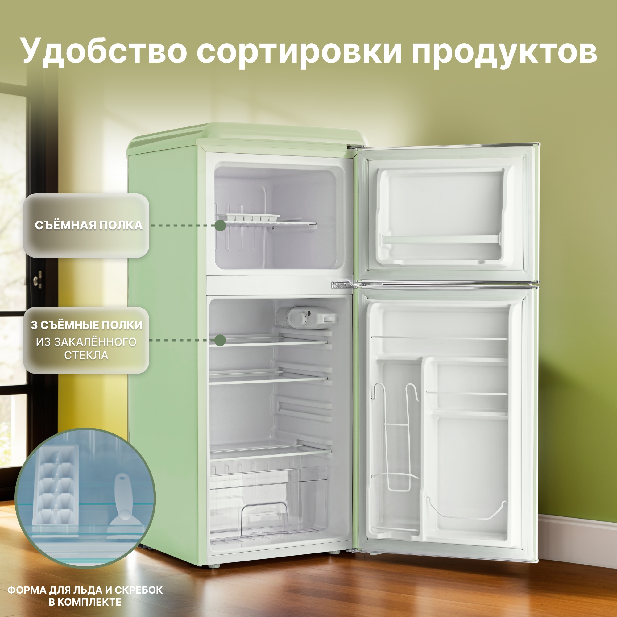 • Отдельностоящий холодильник Tesler RT-152 сочетает в себе классический ретро-дизайн и современные функции.