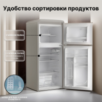 Функциональный и элегантный, двухкамерный холодильник Tesler RT-152  предлагает все необходимое для эффективного охлаждения продуктов. Несмотря на сравнительно небольшие габариты, он оборудован полноценной морозильной камерой, в которой поддерживается температура -18°С. Эргономичный дизайн внутреннего пространства помогает с комфортом расположить еду и напитки. Холодильное отделение предоставляет полезный объем 89 л, внутреннее освещение облегчает просмотр содержимого. Съемные стеклянные полки можно переставить удобным образом, а внизу располагается вместительный ящик для овощей и фруктов. В дверце помимо полок есть отдел для хранения банок, из которого легко доставать напитки. В отделение помещается 6 банок.