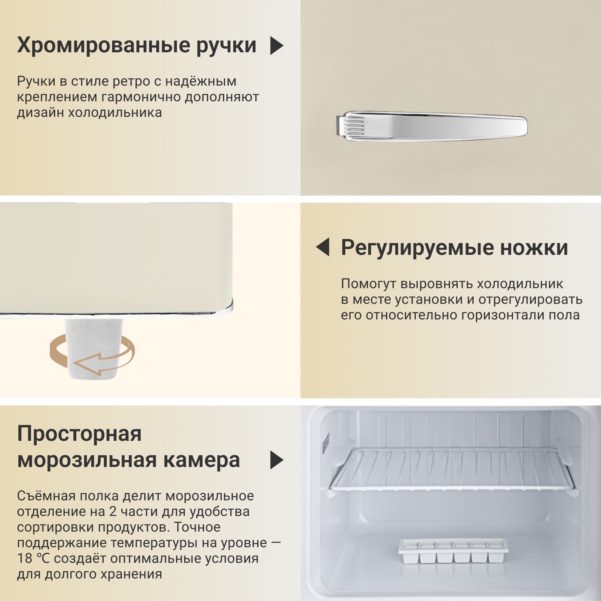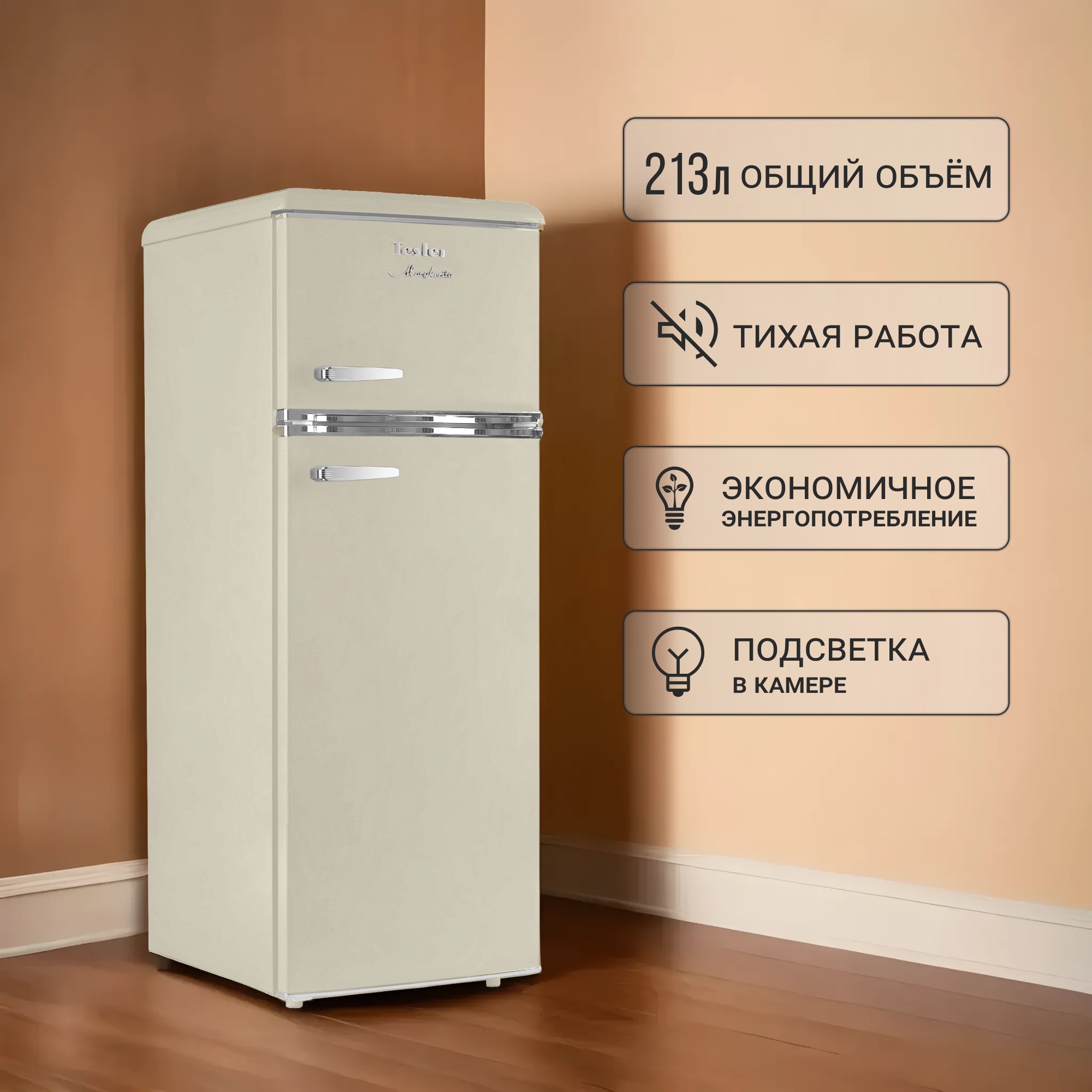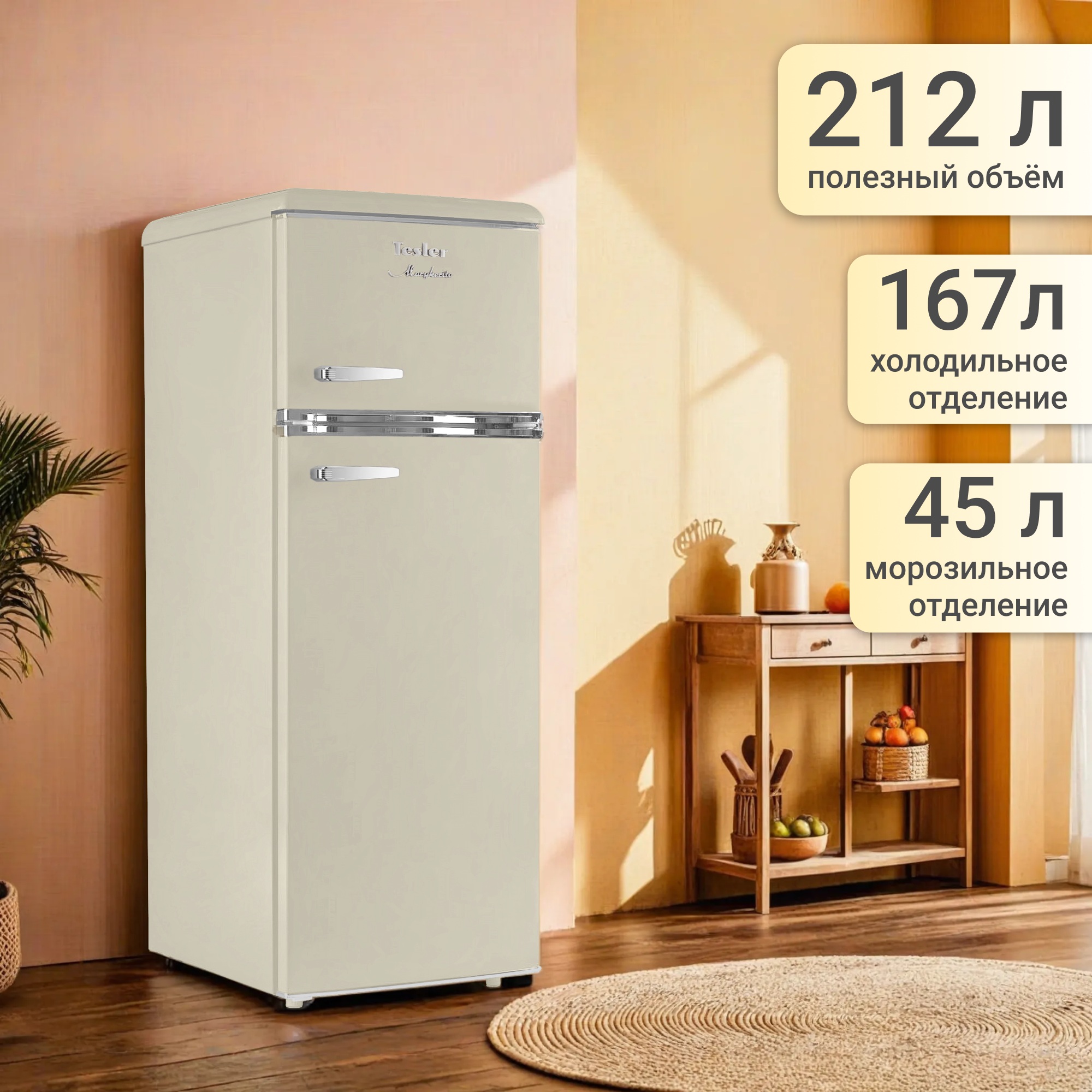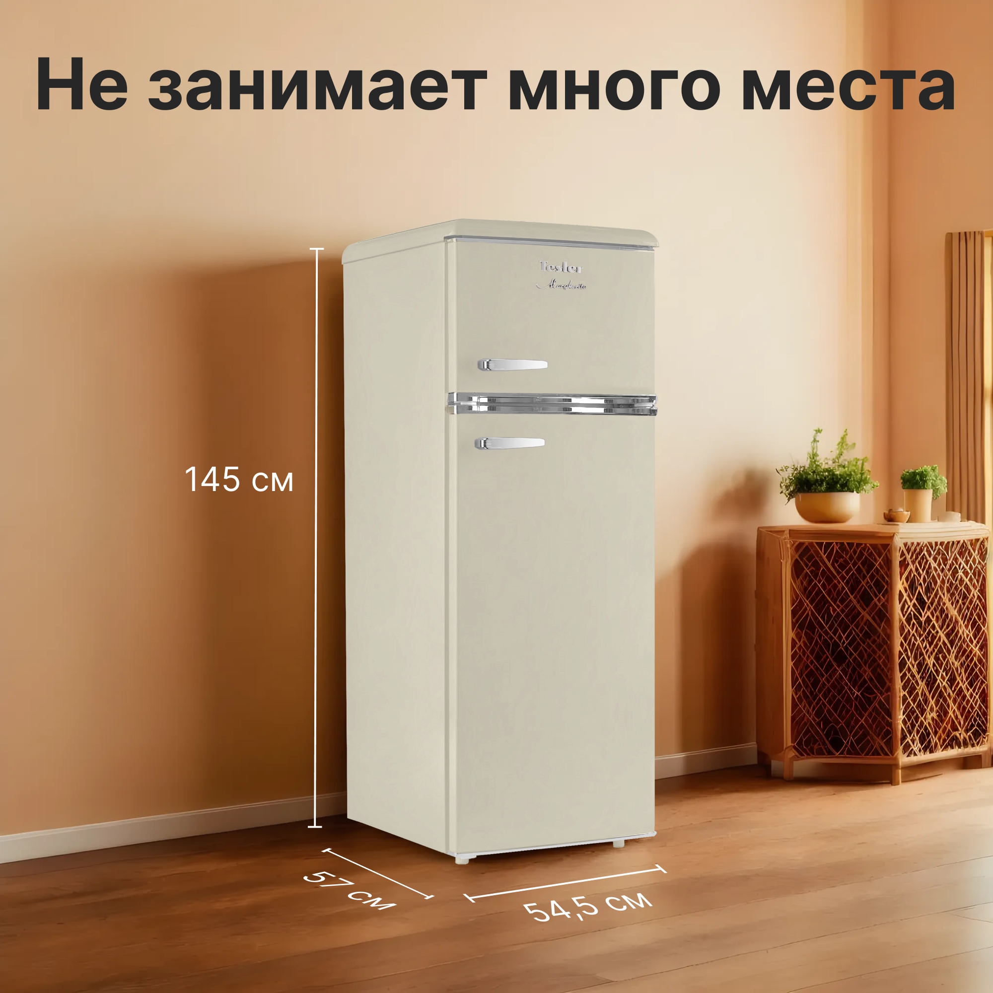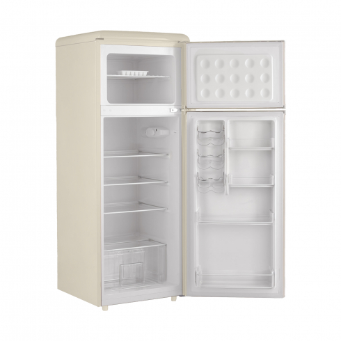 Tesler RT-215 сочетает в себе надежное охлаждение, элегантность и функциональность. Выполненный в ретро-стиле, он придаёт особый шарм пространству вокруг, что делает его идеальным дополнением к кухне.