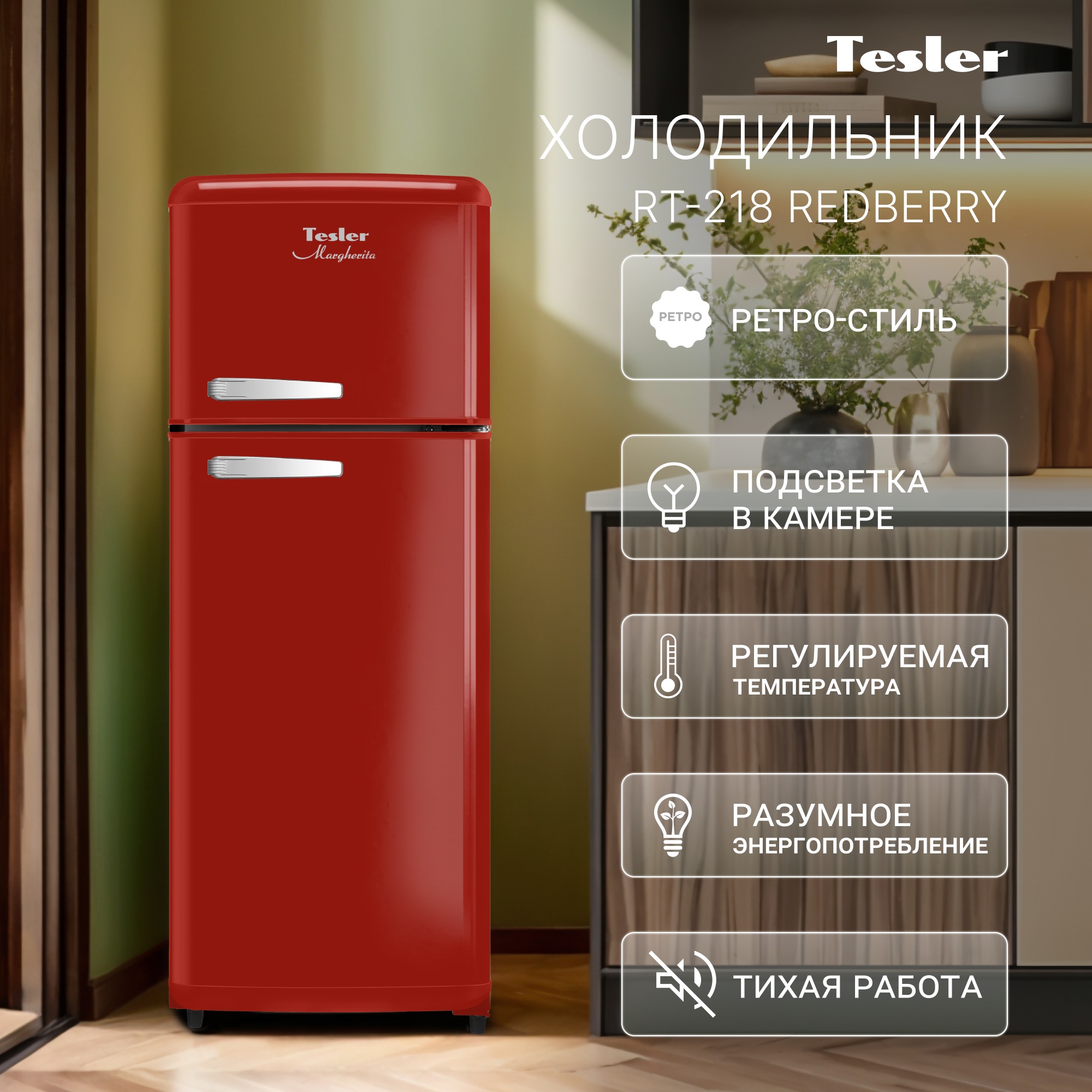 • Холодильник Tesler RT-218 выполнен в винтажном стиле ретро и представлен в нескольких цветах: чёрныйслоновая кость и красная ягода