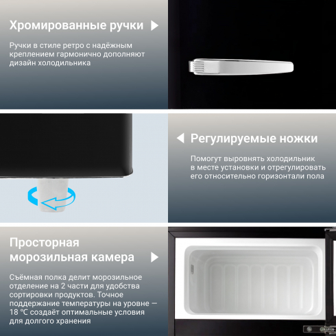 • Отдельностоящий холодильник Tesler RT-95 сочетает в себе классический ретро-дизайн и современные функции.