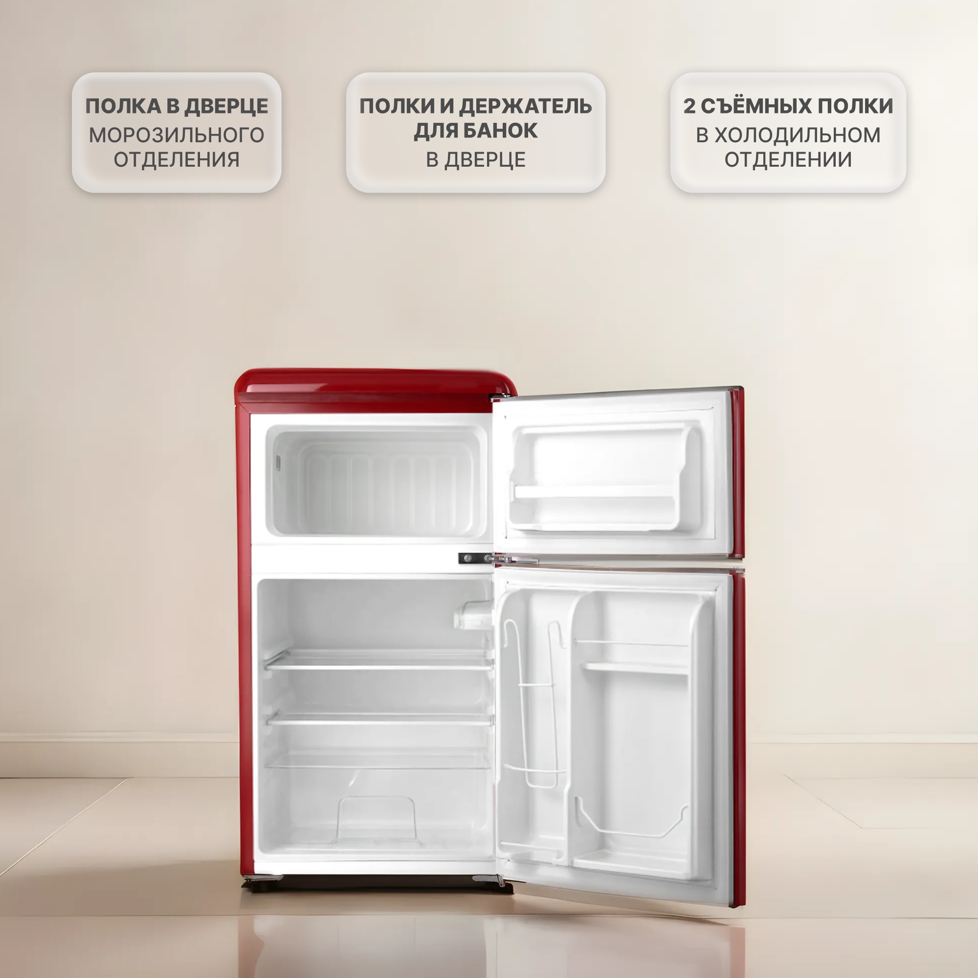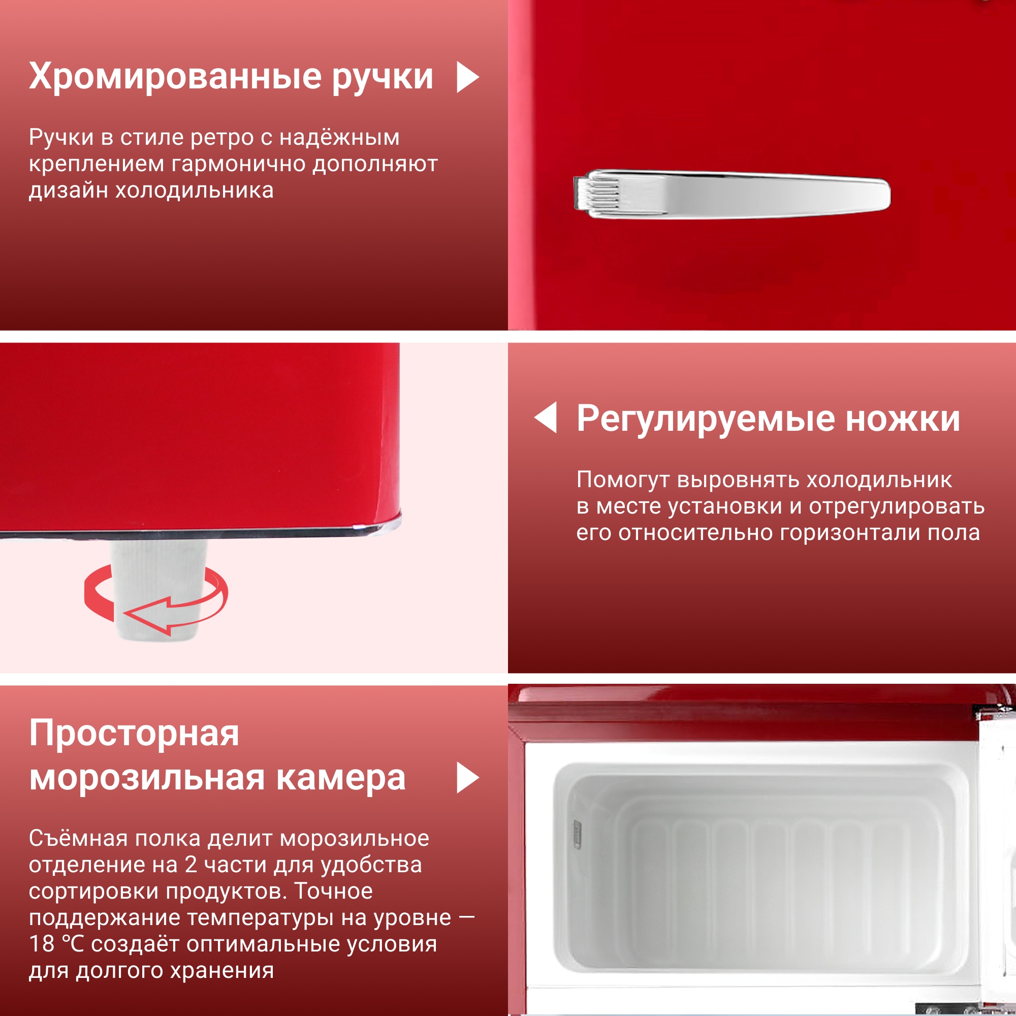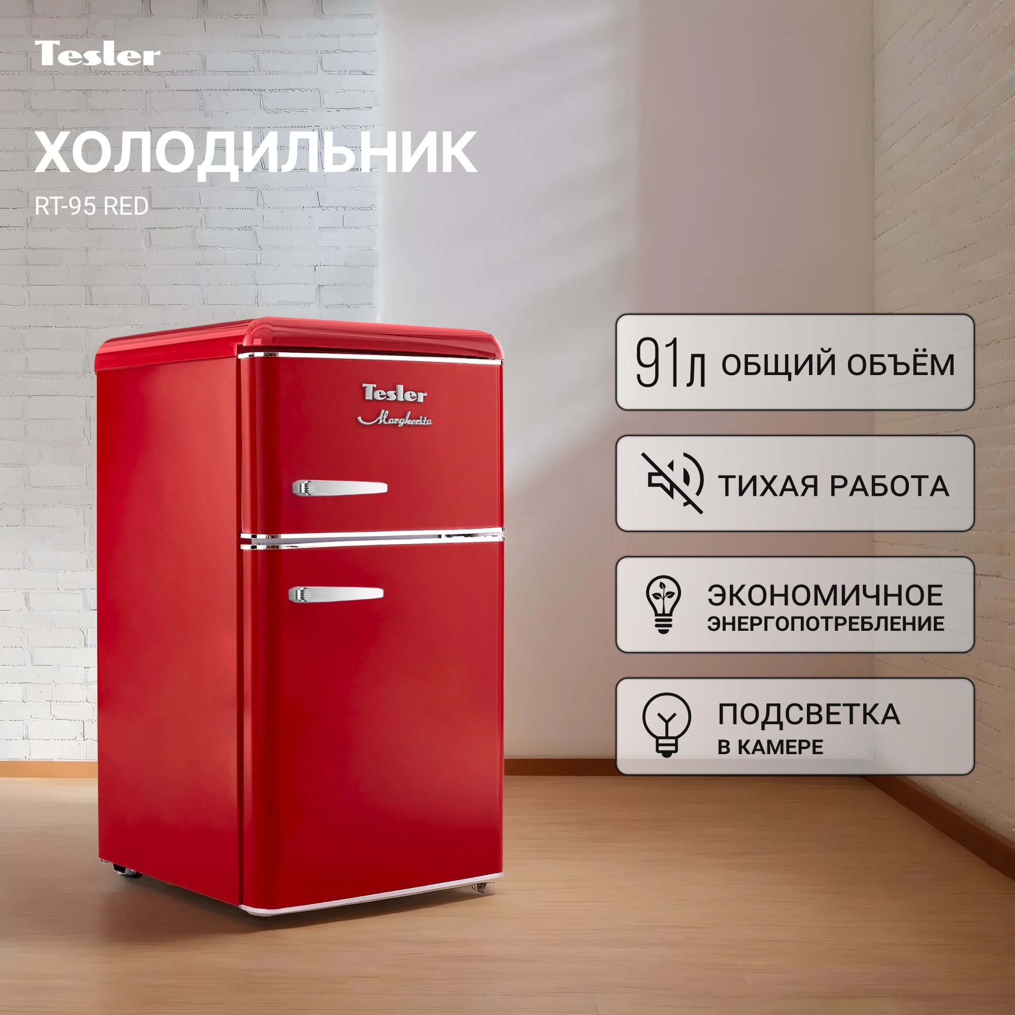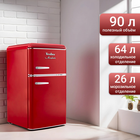 Холодильник Tesler RT-95 сочетает в себе надежное охлаждение, элегантность и функциональность. Выполненный в ретро-стиле, он придаёт особый шарм пространству вокруг, что делает его идеальным дополнением к кухне. Благодаря небольшим размерам он может быть установлен даже в ультракомпактных пространствах.