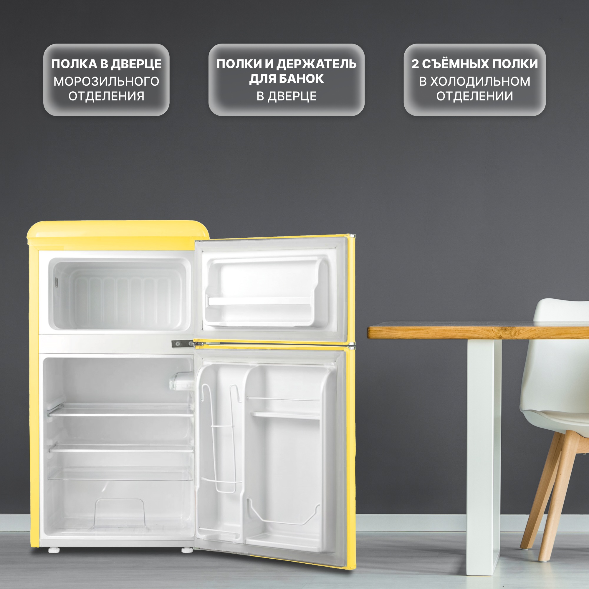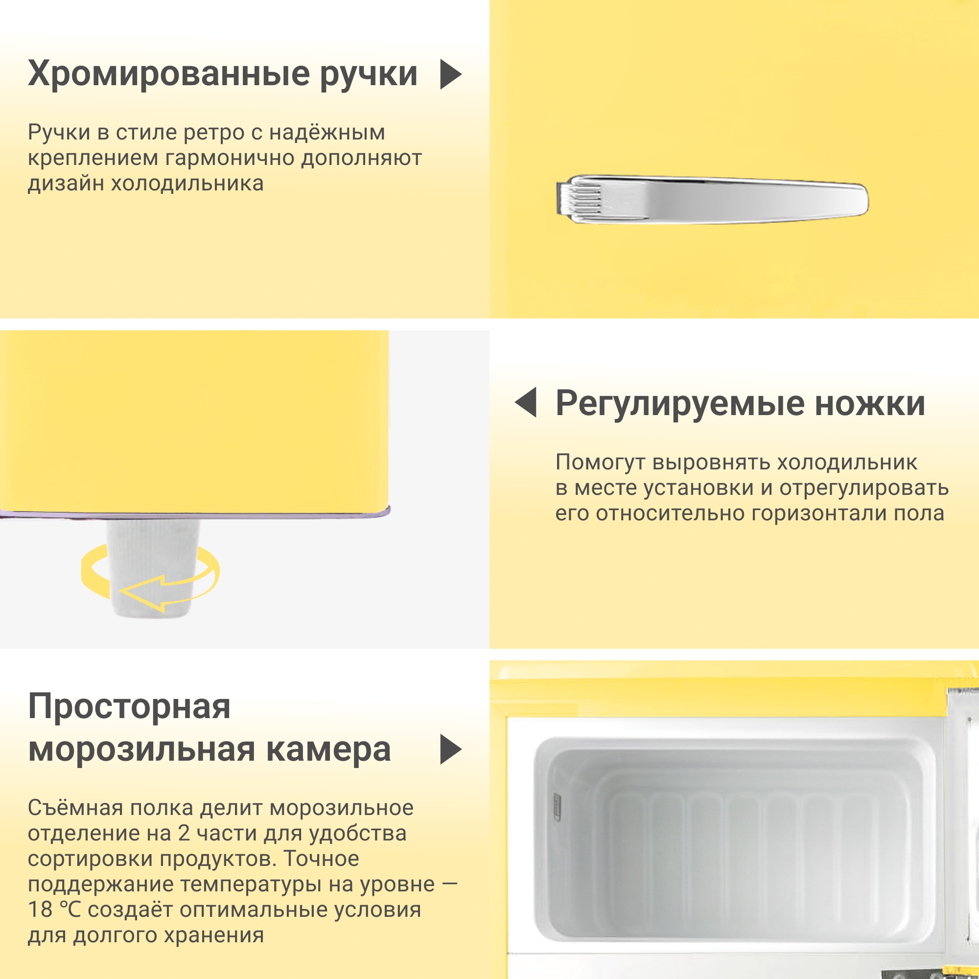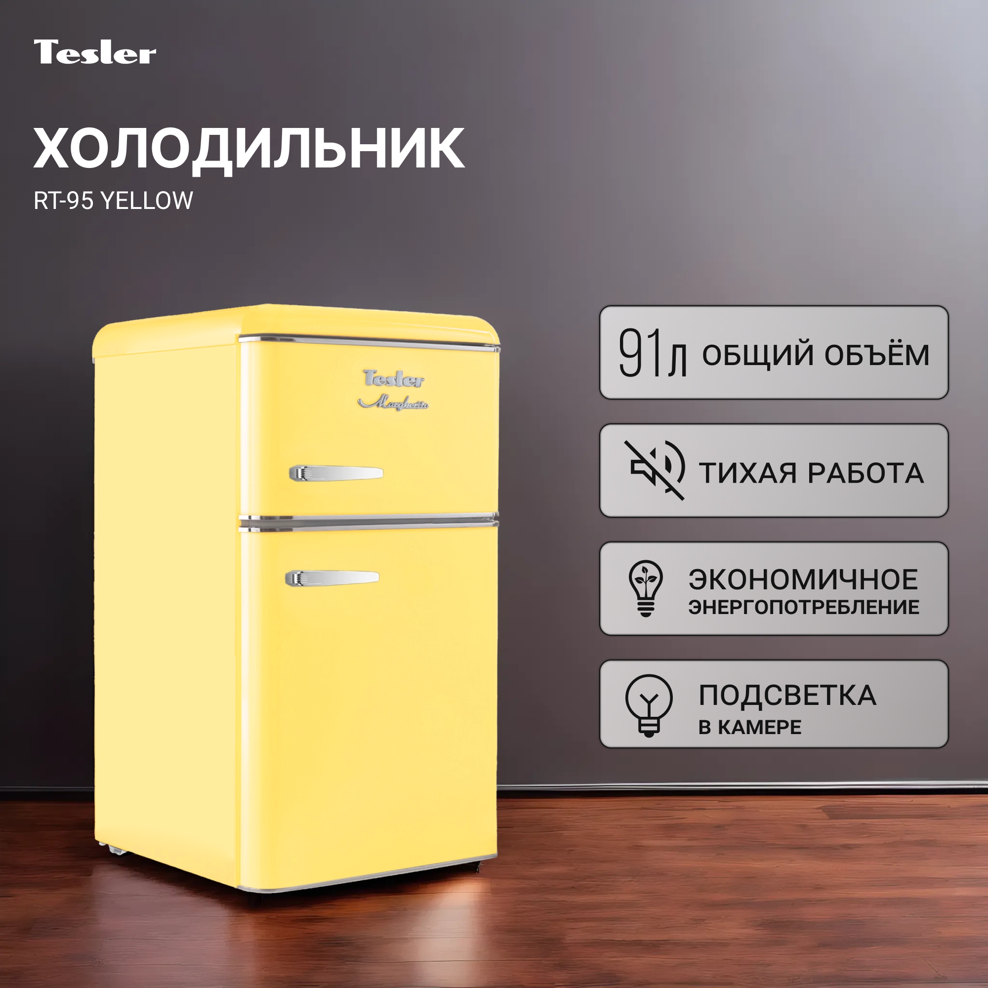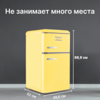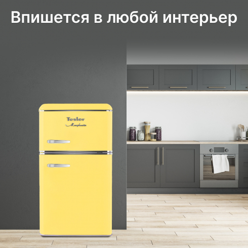 Холодильник Tesler RT-95 сочетает в себе надежное охлаждение, элегантность и функциональность. Выполненный в ретро-стиле, он придаёт особый шарм пространству вокруг, что делает его идеальным дополнением к кухне. Благодаря небольшим размерам он может быть установлен даже в ультракомпактных пространствах.