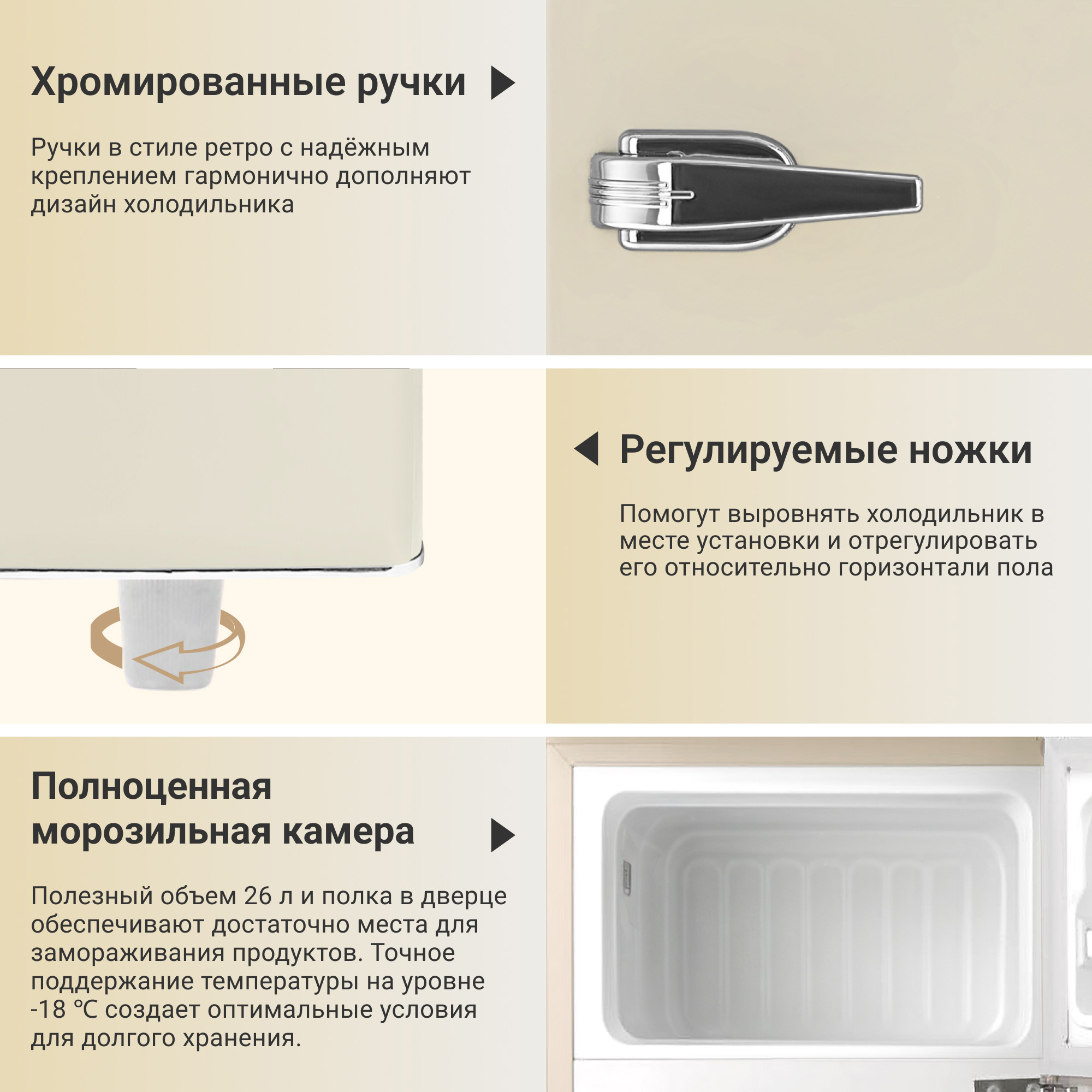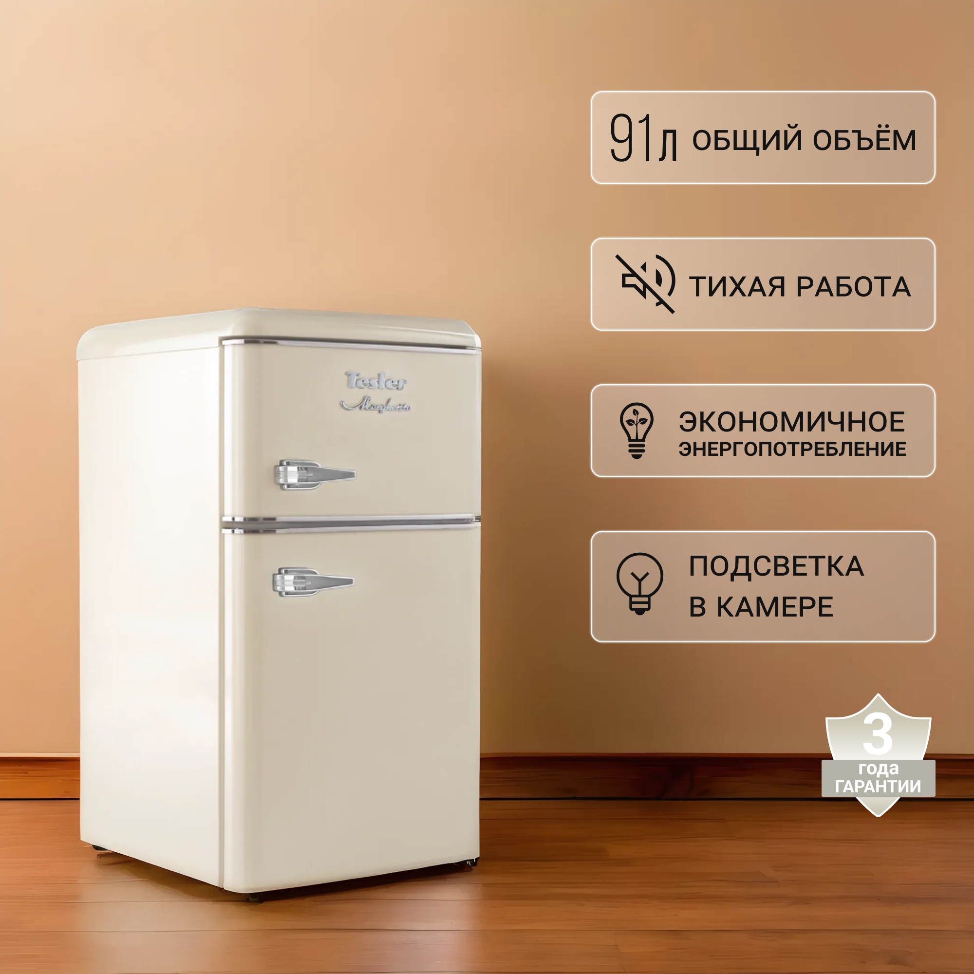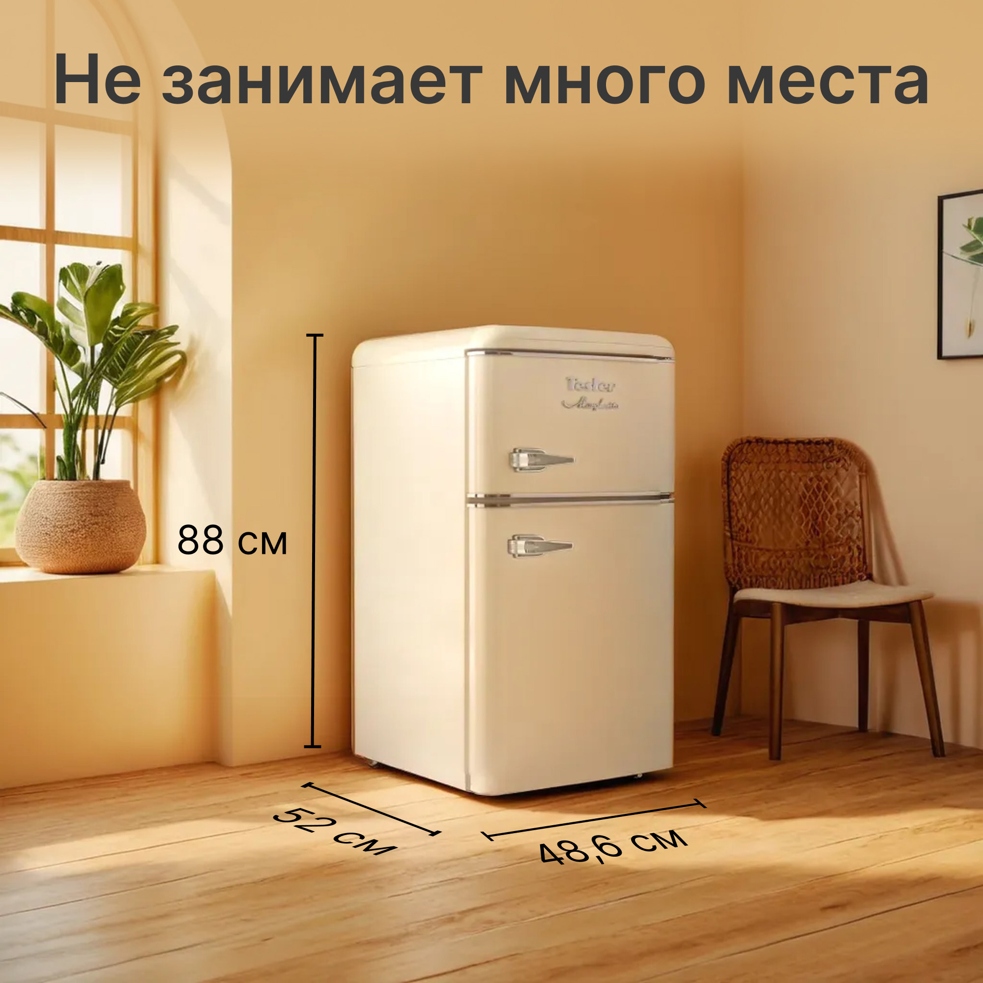 Холодильник Tesler RT-97 сочетает в себе надежное охлаждение, элегантность и функциональность. Выполненный в ретро-стиле, он придаёт особый шарм пространству вокруг, что делает его идеальным дополнением к кухне. Благодаря небольшим размерам он может быть установлен даже в ультракомпактных пространствах. Модель доступна в черном, красном, бежевом и песочно-сером цветах, что позволяет выбрать вариант, который органично впишется в ваш интерьер.