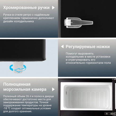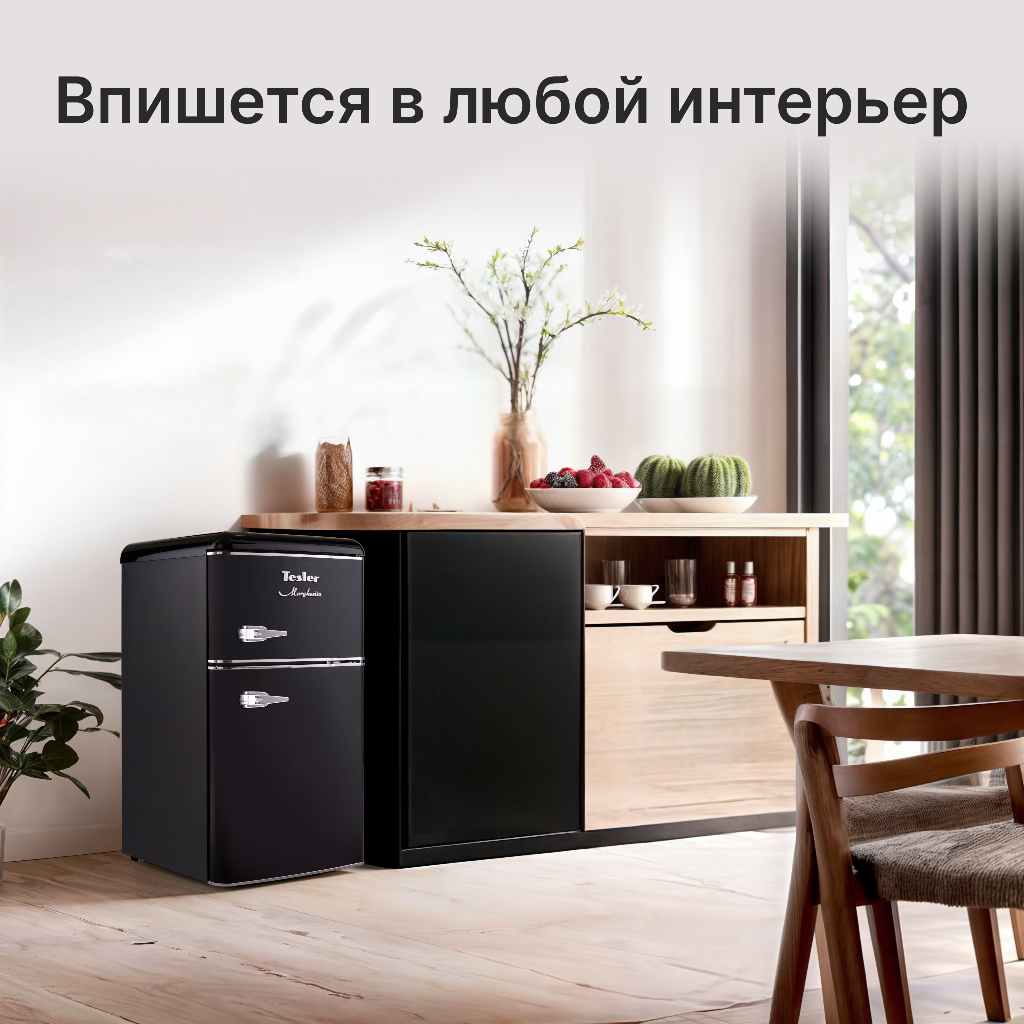Холодильник Tesler RT-97 сочетает в себе надежное охлаждение, элегантность и функциональность. Выполненный в ретро-стиле, он придаёт особый шарм пространству вокруг, что делает его идеальным дополнением к кухне. Благодаря небольшим размерам он может быть установлен даже в ультракомпактных пространствах. Модель доступна в черном, красном, бежевом и песочно-сером цветах, что позволяет выбрать вариант, который органично впишется в ваш интерьер.