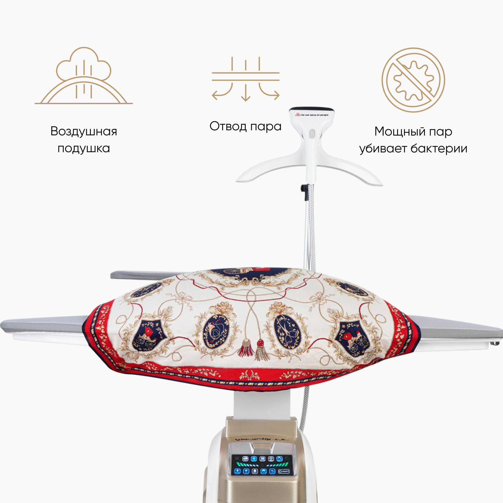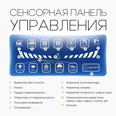 Сенсорная панель делает управление прибором интуитивно понятным, а информативный LED дисплей отображает выбранные функции. Разные режимы для глажения обеспечивают особый подход к каждой вещи – вы можете выбрать температурный режим в соответствии с типом ткани (нейлон, шёлк, шерсть, хлопок, лён). На дисплее можно выбрать режим работы прибора, отрегулировать мощность подачи пара, а также переключить режим глажения на вертикальное отпаривание. Световые индикаторы покажут готовность системы к подаче пара, процесс нагрева и запуск автоматической очистки. Отследить окончание воды поможет индикатор отсутствия воды. Устройство имеет голосовое оповещение с возможностью отключения.