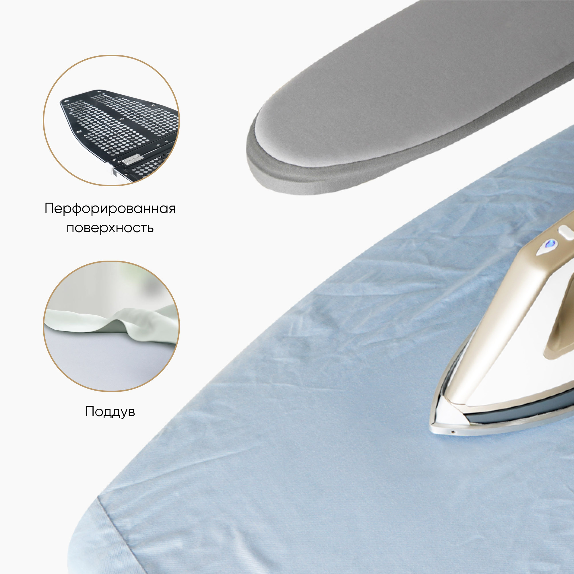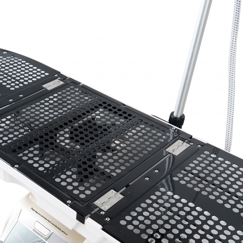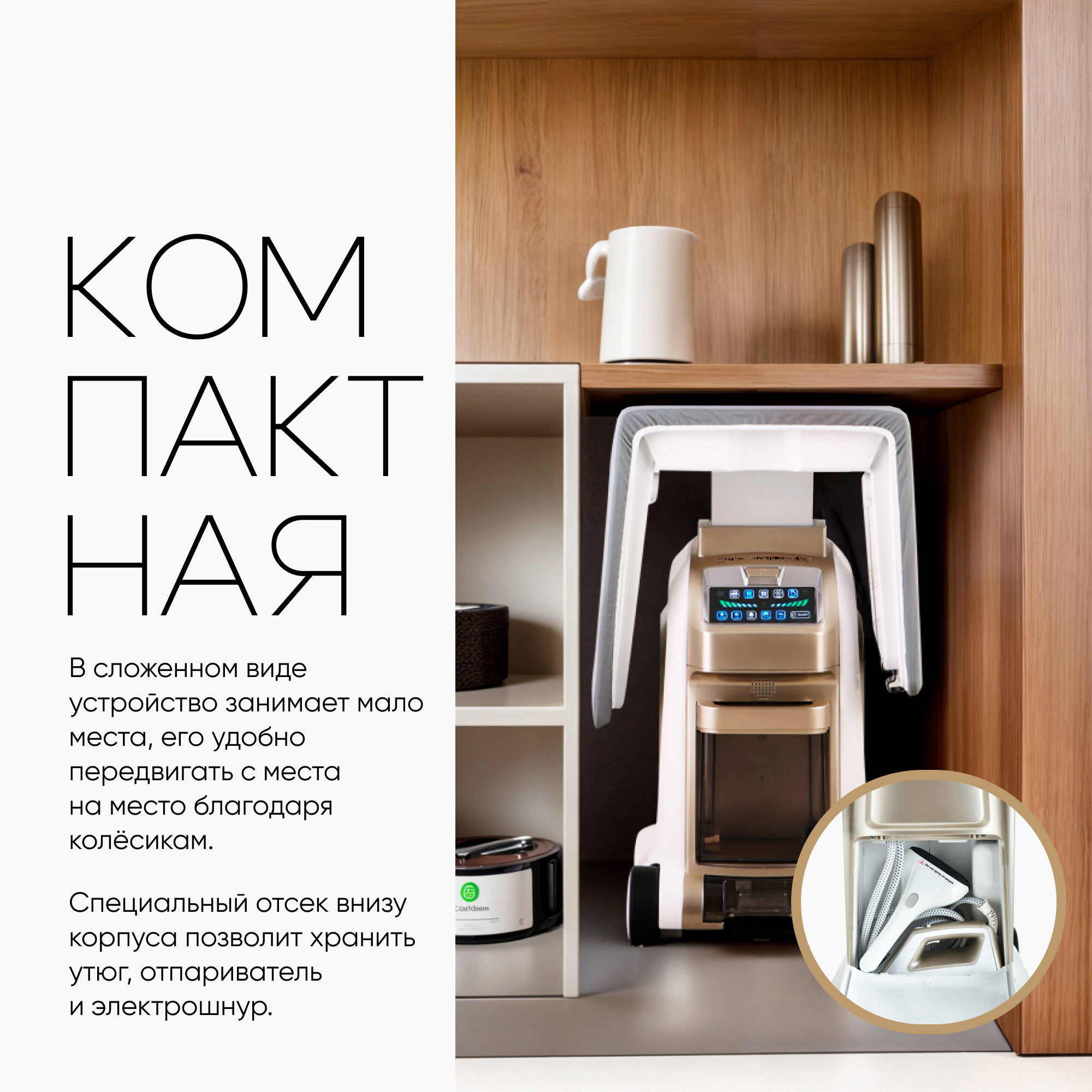 В сложенном виде устройство занимает мало места, его удобно передвигать с места на место благодаря колесикам. Специальный отсек внизу корпуса позволит хранить утюг, отпариватель и электрошнур.