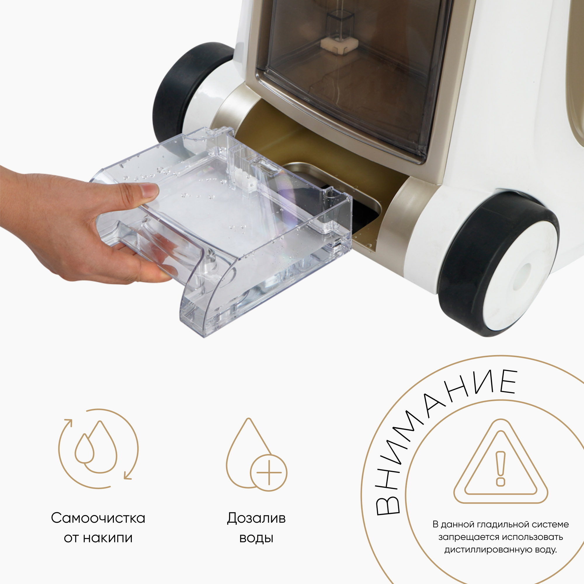 В данной гладильной системе запрещается использовать дистиллированную воду.