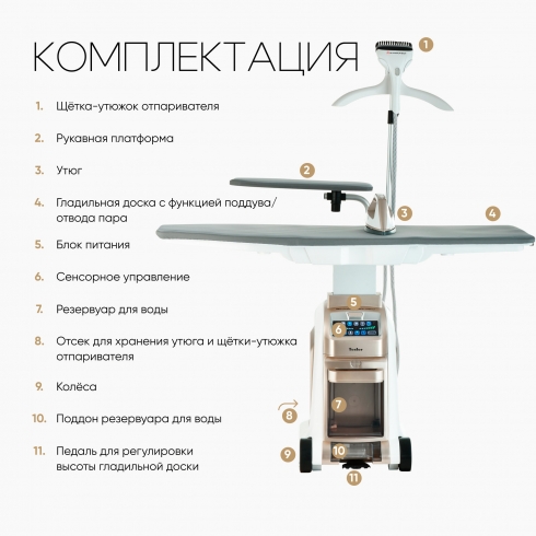 Комплектация включает в себя утюг, паровой шланг с паровым утюжком для вертикального отпаривания, гладильную доску, рукавную платформу, чехол для рукавной платформы, щетку отпаривателя, чехол для гладильной доски, подкладку в подставку для утюга, плечики, и тефлоновую насадку.