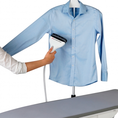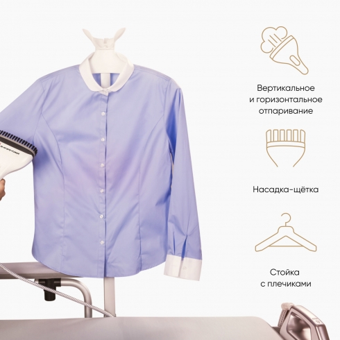 Для вертикального отпаривания предусмотрены регулируемая по высоте стойка с плечиками и лёгкая насадка. Отпариватель прост в использовании, безопасен для любых элементов одежды и является идеальным выбором для деликатных тканей. Насадкой-щёткой удобно работать длительное время, на её корпусе расположена кнопка-индикатор подачи пара.