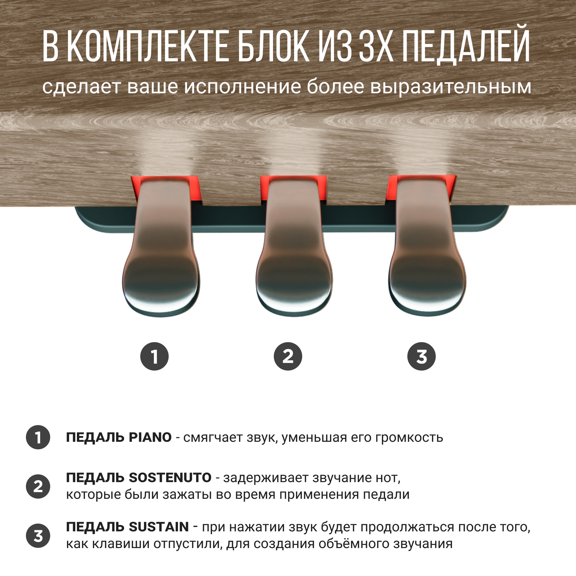 Для большей выразительности при исполнении, и сходства с акустическим фортепиано в комплект к ST-8805 входит блок из трёх педалей. Педаль сустейна (правая) - при нажатии звук будет продолжаться после того, как клавиши отпустили, для создания объёмного звучания. Нажатие педаль пиано (левая) смягчает звук, уменьшая его громкость. После нажатия задерживающей педали (средняя) задержится звучание только тех нот, которые были зажаты во время применения педали.