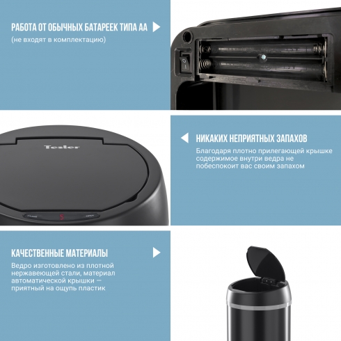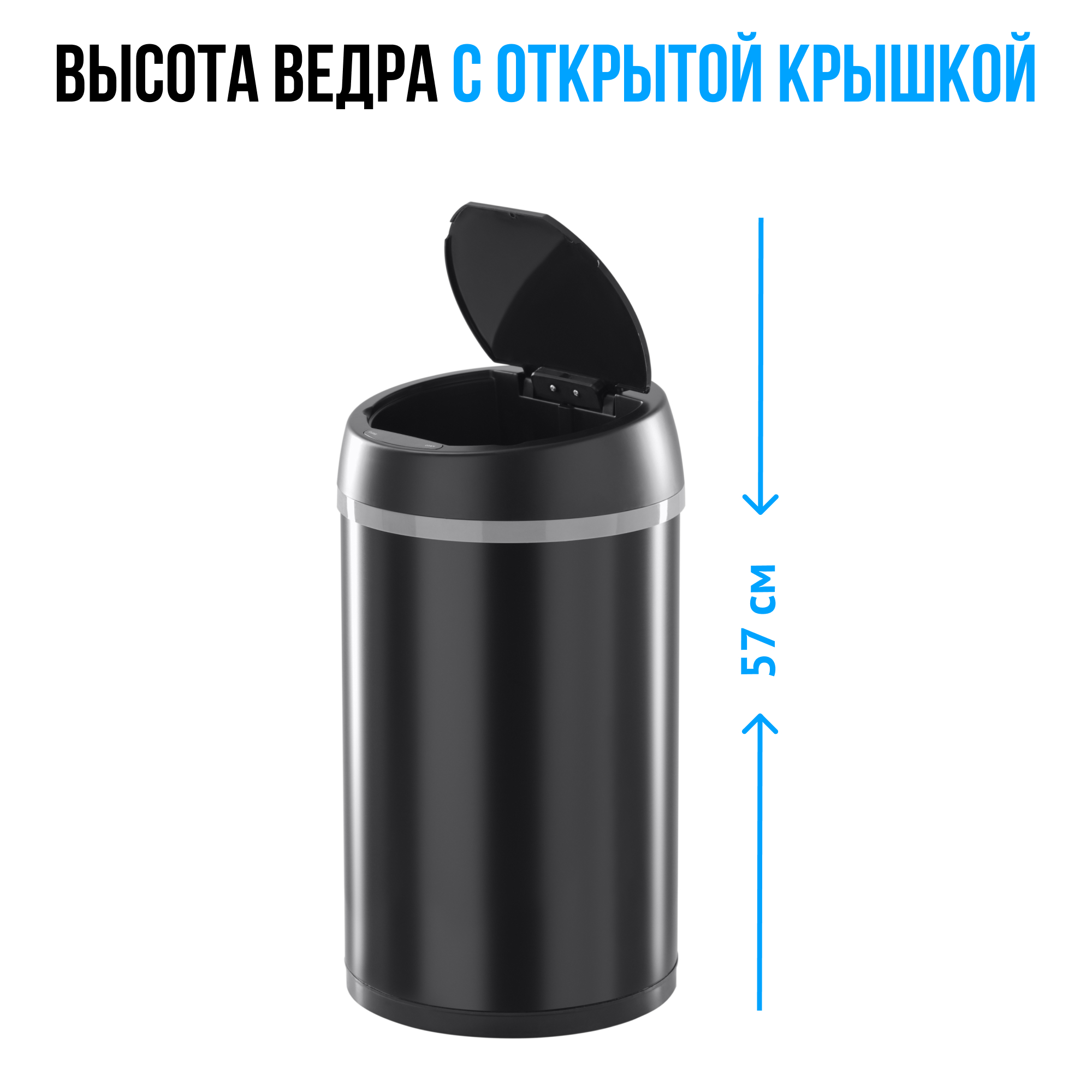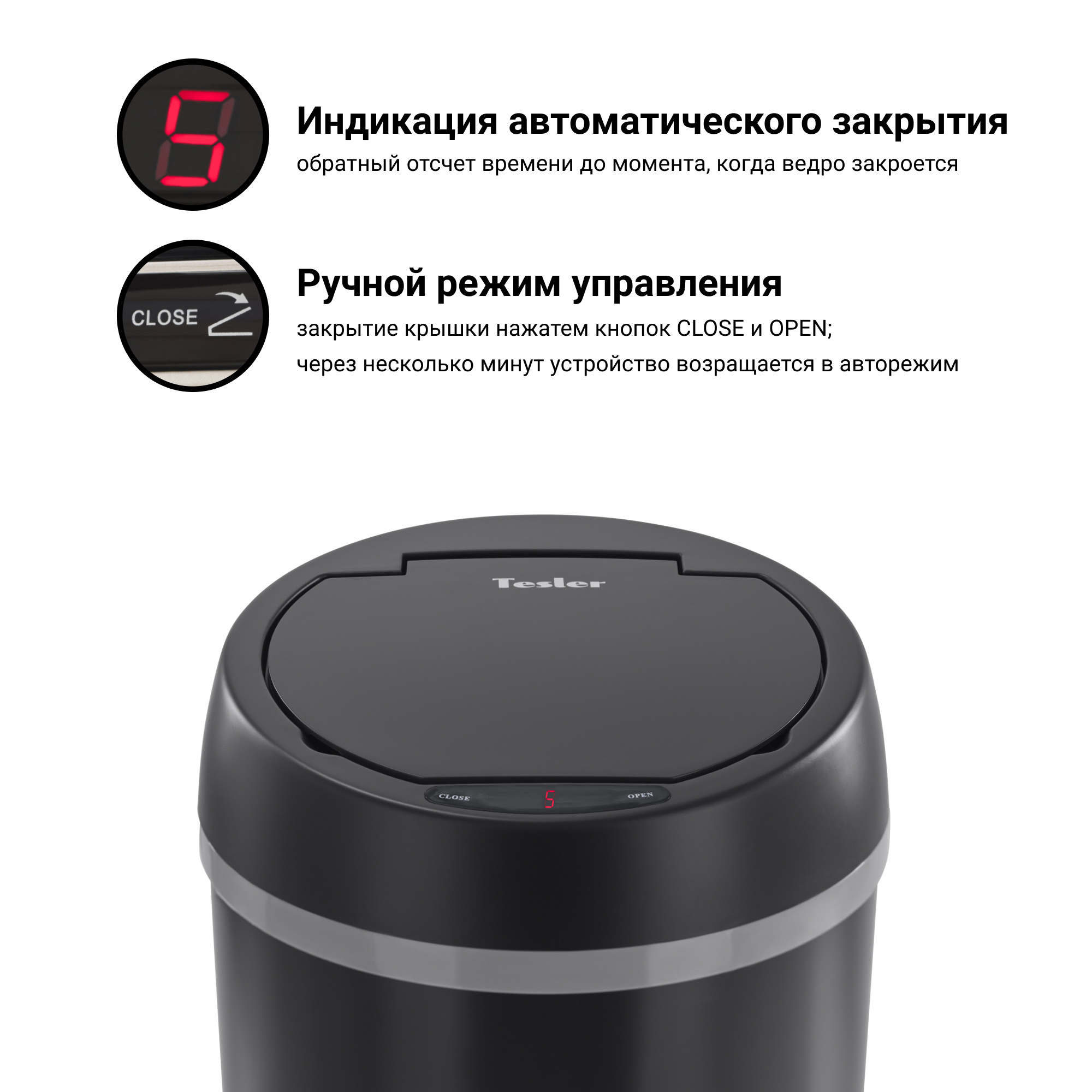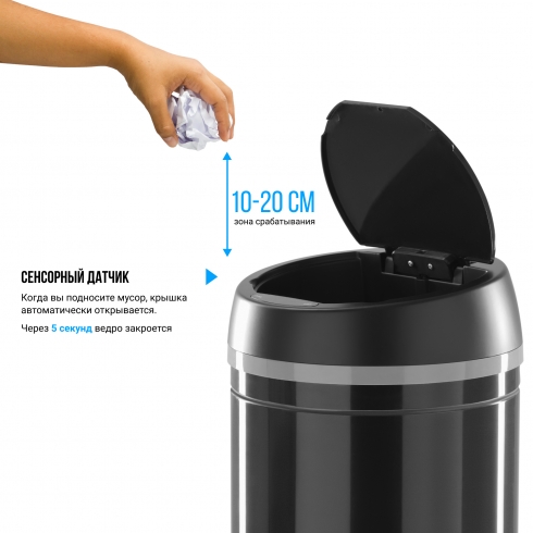 Отличительной особенностью таких урн является наличие сенсорного датчика, который самостоятельно открывает крышку мусоросборника при поднесении руки на расстояние 10-15 см от него. Теперь не нужно прикасаться к ведру, чтобы выкинуть мусор, и ваши руки останутся чистыми. Если вы забыли закрыть крышку - через 5 секунд она автоматически закроется сама.