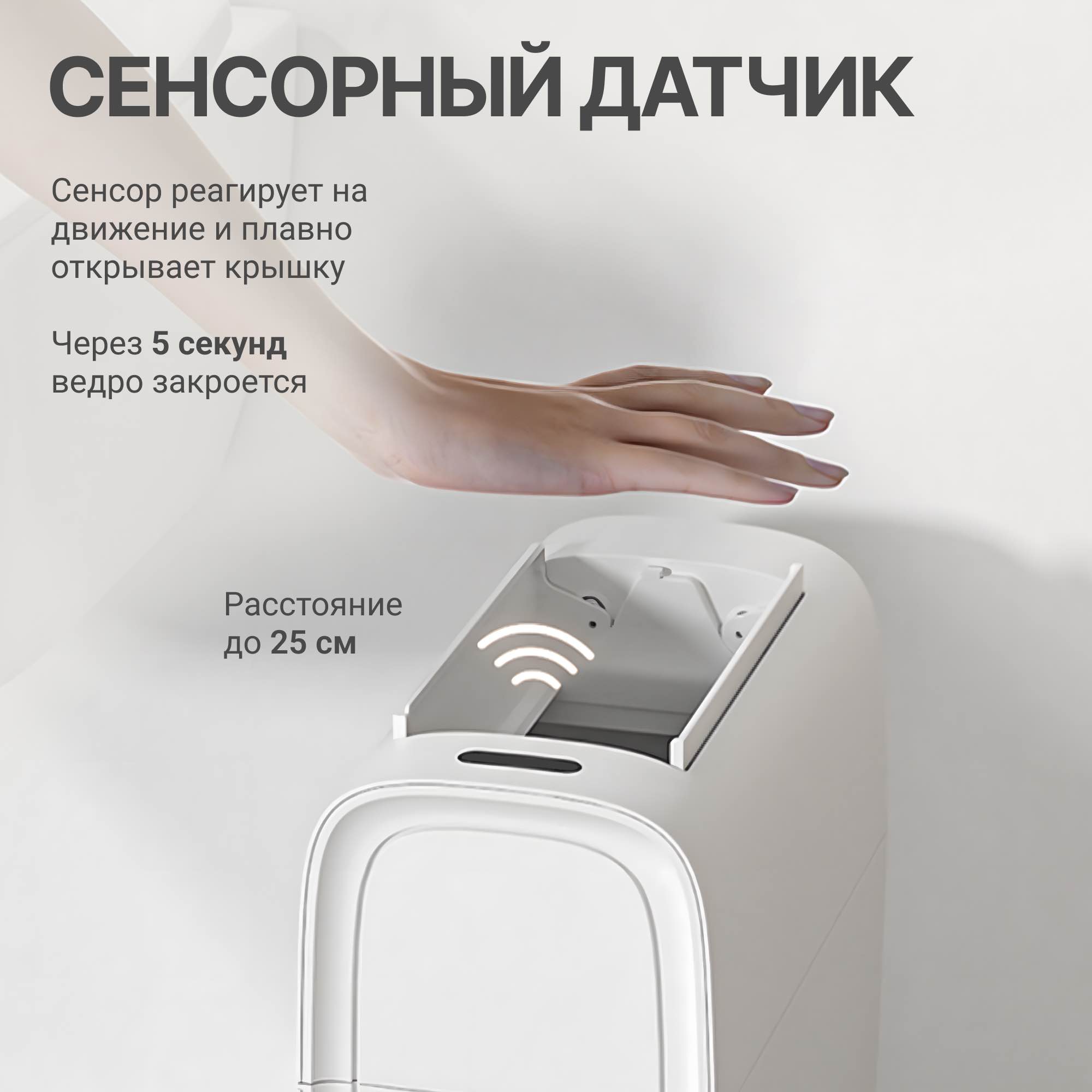 Устройство работает на основе микропроцессорного управления и высокоточного сенсора. Система активирует бесконтактное открывание крышки при обнаружении движения на расстоянии до 25 см. Данный принцип работы исключает необходимость физического контакта с корпусом. Сенсорные кнопки открытия и закрытия дверок, расположены на поверхности крышки и позволяют управлять работой дверок в ручном режиме.