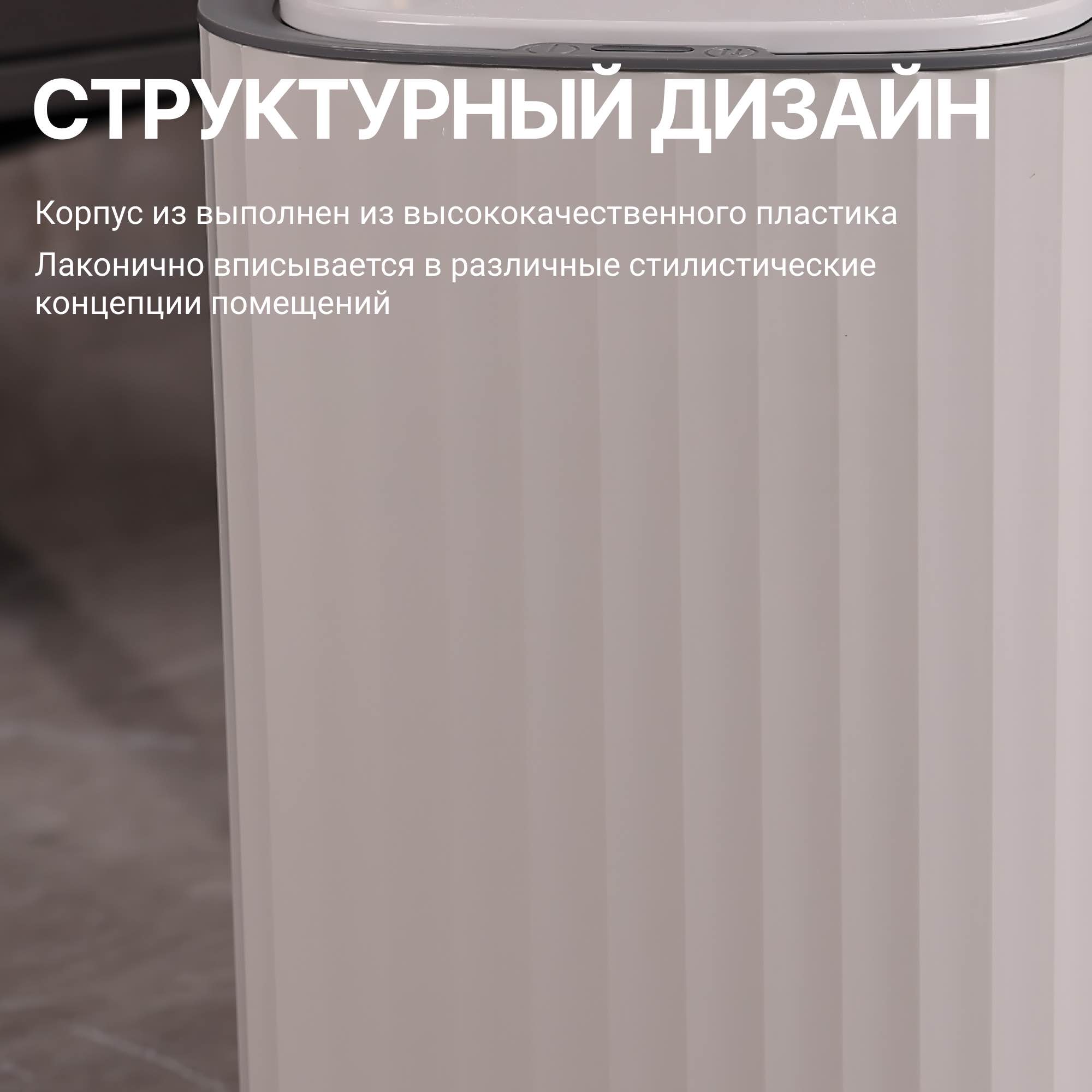 Внешний корпус устройства отличается рельефной поверхностью с выраженными вертикальными ребрами, что не только формирует эстетически сдержанный облик, но и повышает устойчивость конструкции. Плоская прямоугольная крышка со скругленными углами выполнена в едином цветовом решении с корпусом и дополнена контрастным серым обрамлением по основанию и канту. Дизайн модели подчеркивает минималистичный и нейтральный стиль, обеспечивая гармоничное сочетание с различными интерьерами.