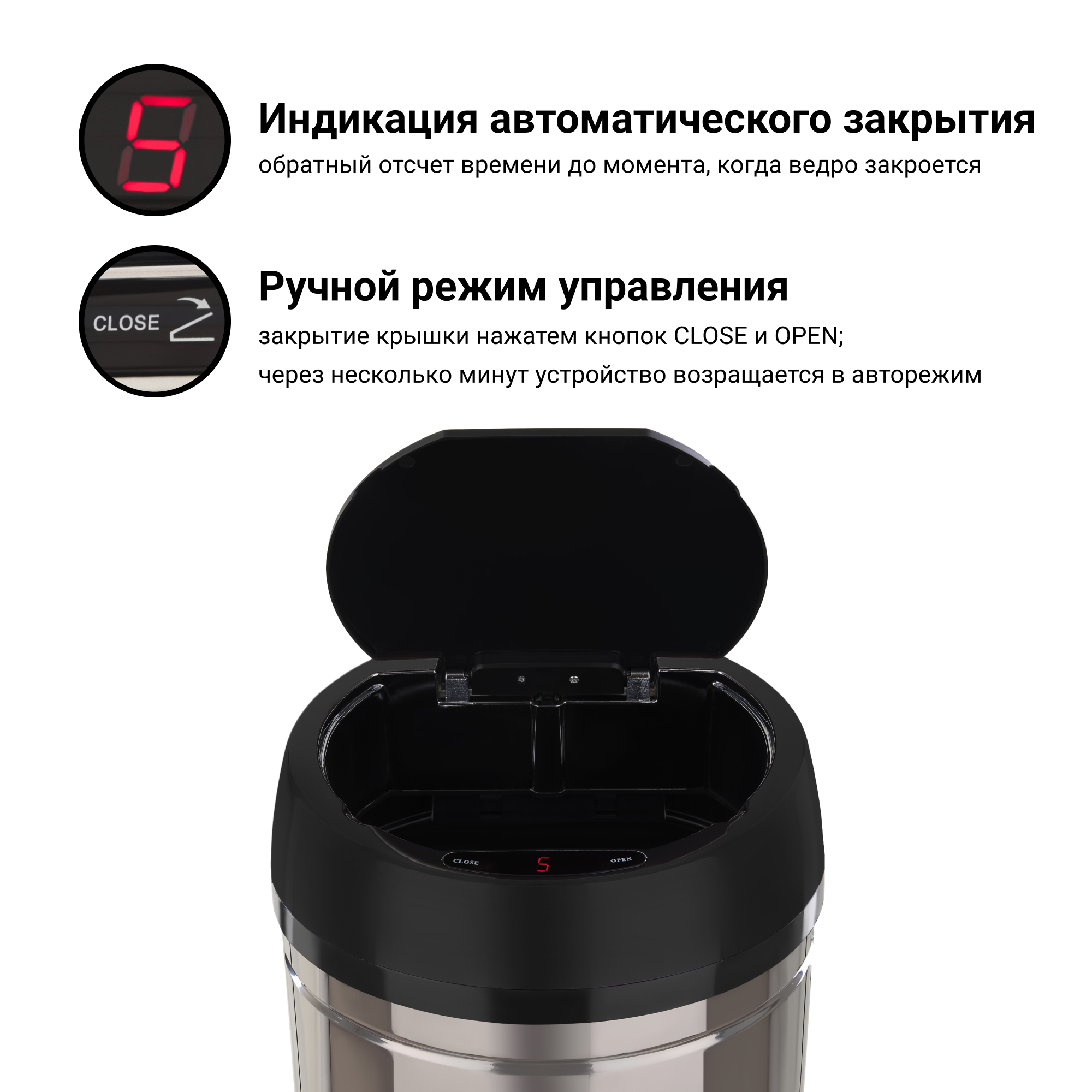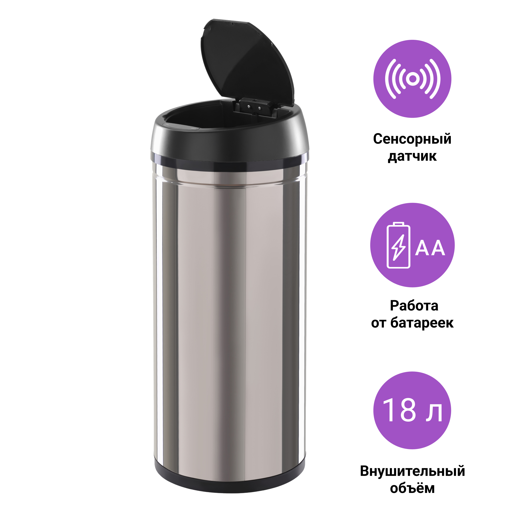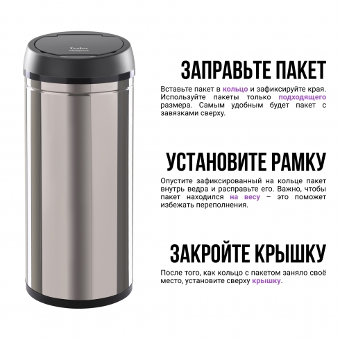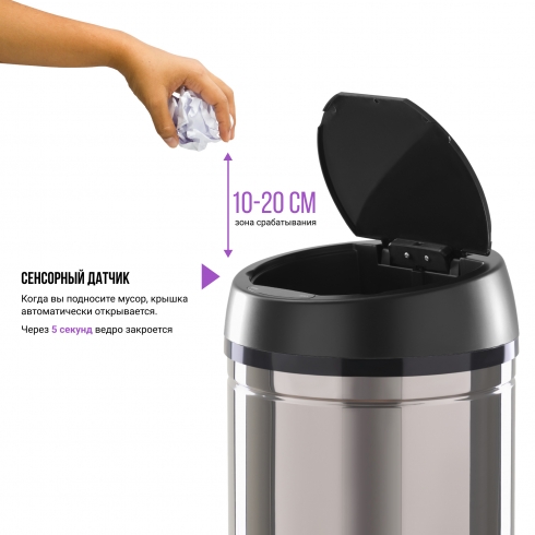 Отличительной особенностью таких урн является наличие сенсорного датчика, который самостоятельно открывает крышку мусоросборника при поднесении руки на расстояние 10-15 см от него. Теперь не нужно прикасаться к ведру, чтобы выкинуть мусор, и ваши руки останутся чистыми. Если вы забыли закрыть крышку - через 5 секунд она автоматически закроется сама.