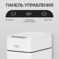 Управление осуществляется с помощью инфракрасного сенсора: крышка открывается бесконтактно при приближении руки на расстояние до 20 см. Дополнительно есть панель с LED-индикацией и кнопками ручного управления. Двустворчатый механизм не требует дополнительного пространства для открытия крышки, благодаря двойным распашным створкам, которые утапливаются при открытии.