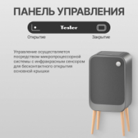 Управление осуществляется посредством микропроцессорной системы с инфракрасным сенсором для бесконтактного открытия основной крышки. Дополнительно на панели управления расположены сенсорные кнопки, позволяющие активировать ручной режим работы. Двустворчатый механизм открытия дверок функционирует в бесшумном режиме.