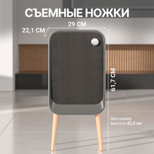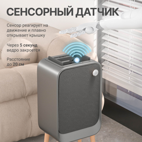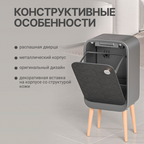 Корпус устройства изготовлен из металла и доступен в двух цветовых вариантах: белый с декоративной вставкой под натуральное дерево WOOD и серый матовый LEATHER. Вместимость внутреннего контейнера составляет 20 литров, что обеспечивает удобство эксплуатации в условиях интенсивного использования.