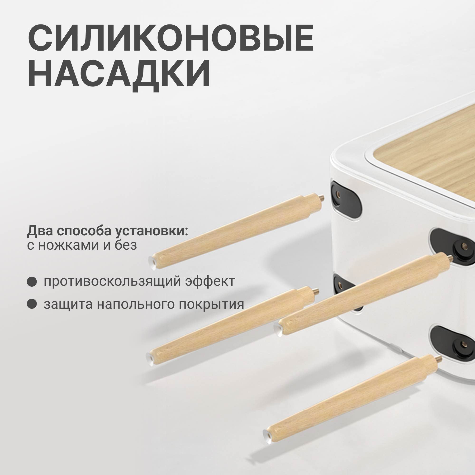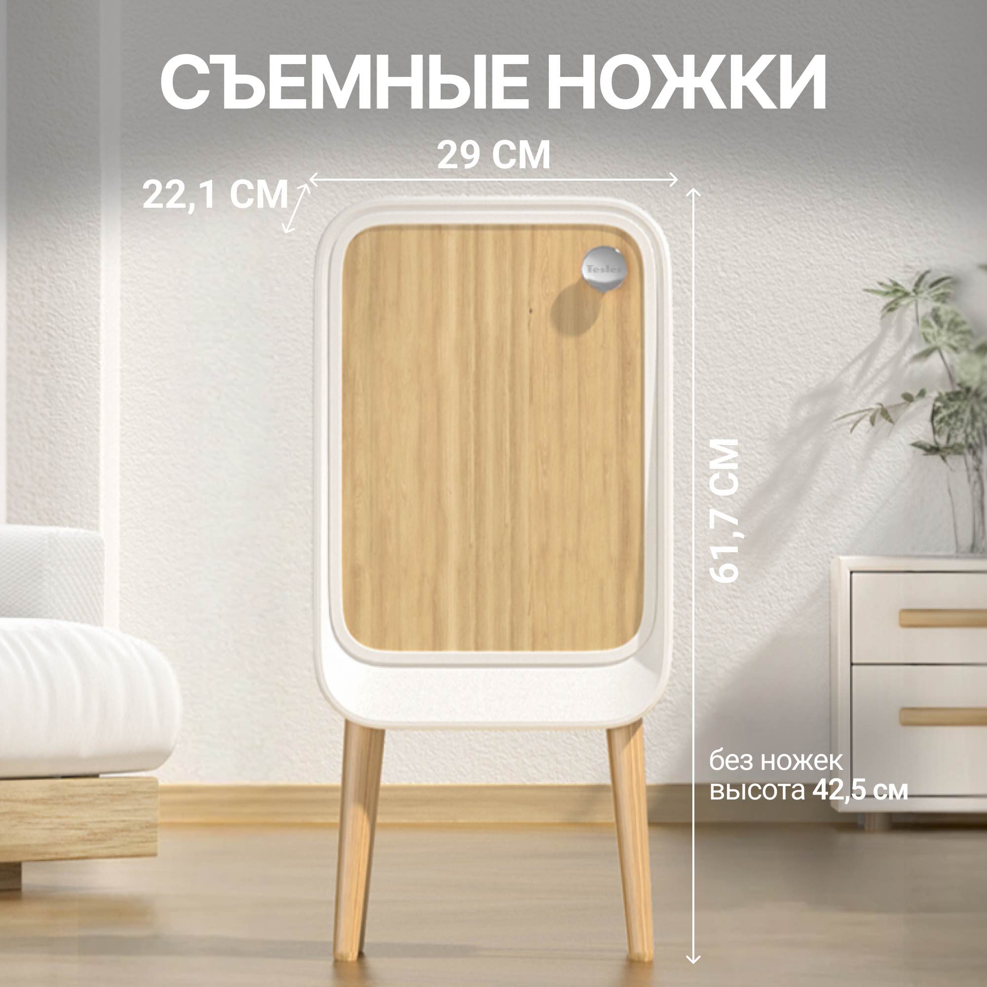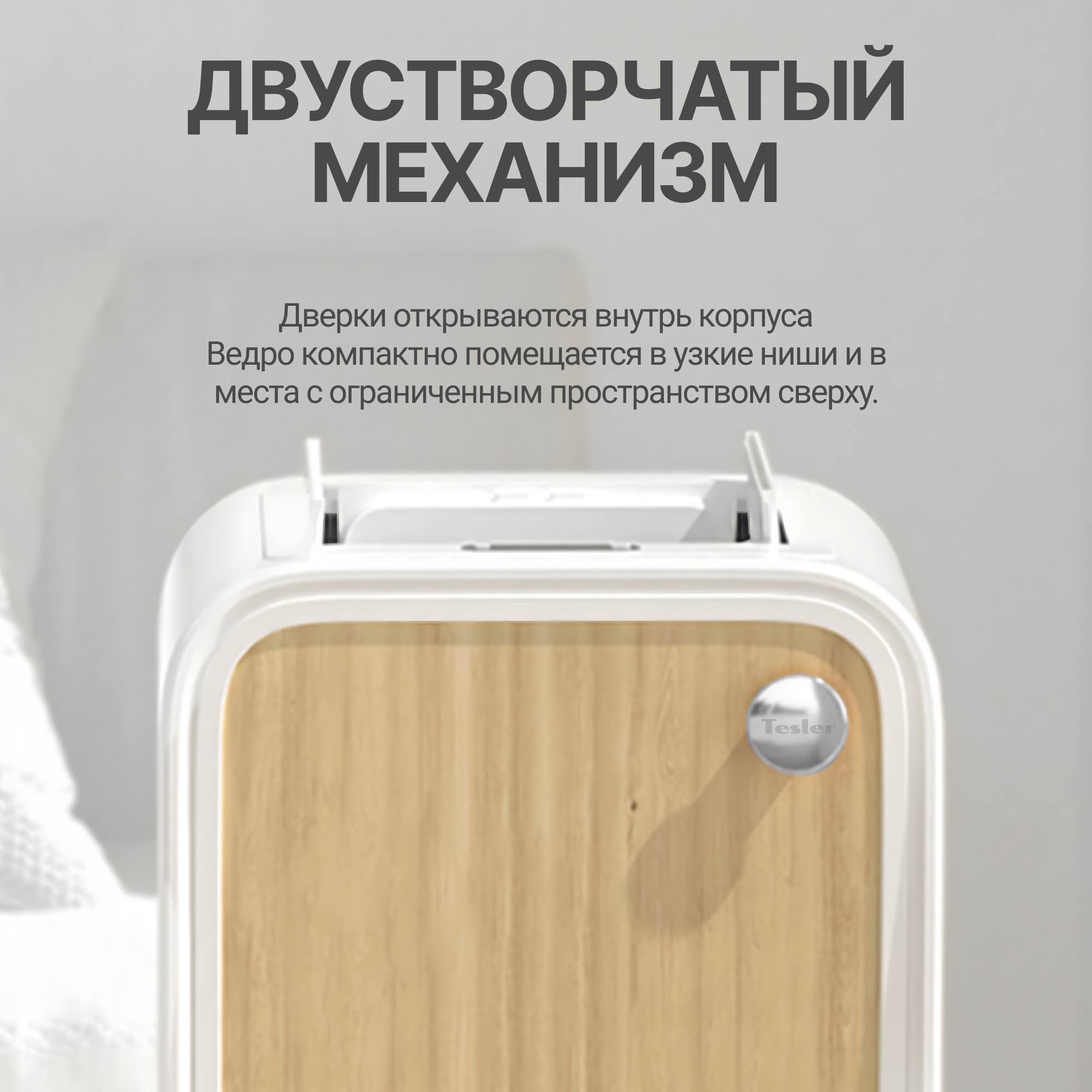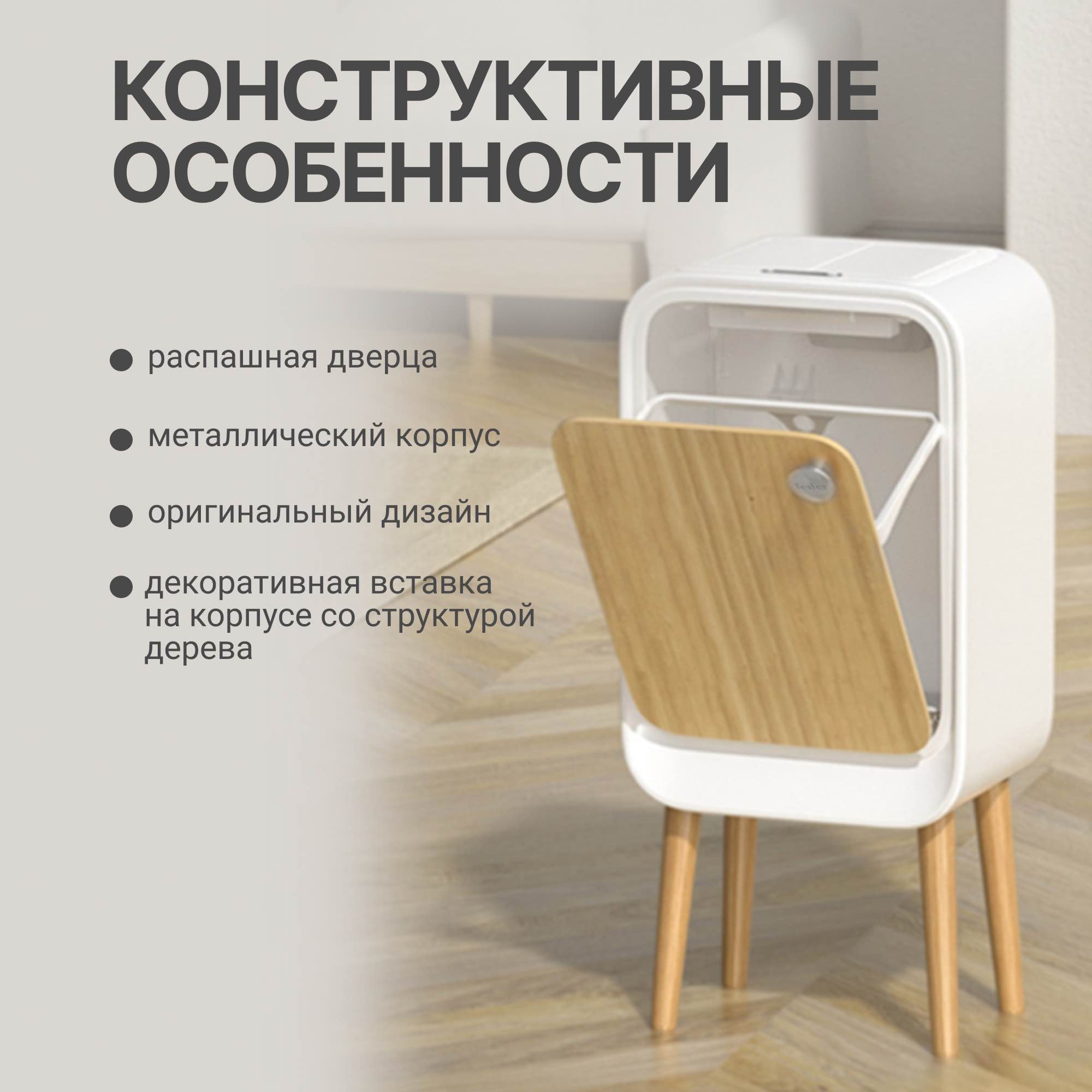 Корпус устройства изготовлен из металла и доступен в двух цветовых вариантах: белый с декоративной вставкой под натуральное дерево WOOD и серый матовый LEATHER. Вместимость внутреннего контейнера составляет 20 литров, что обеспечивает удобство эксплуатации в условиях интенсивного использования.