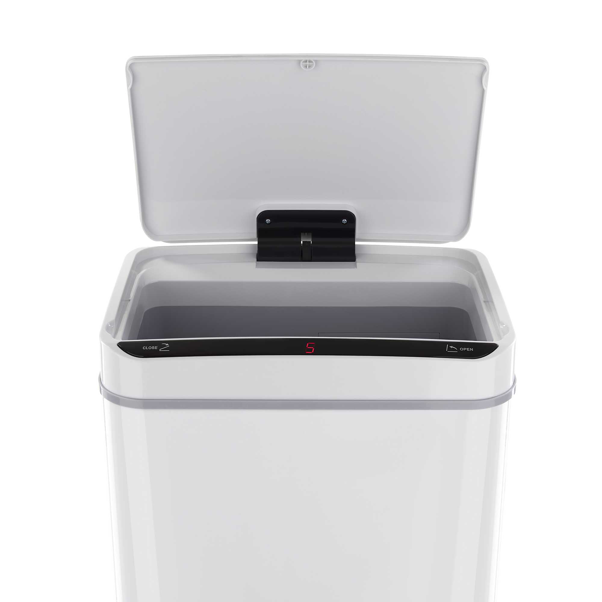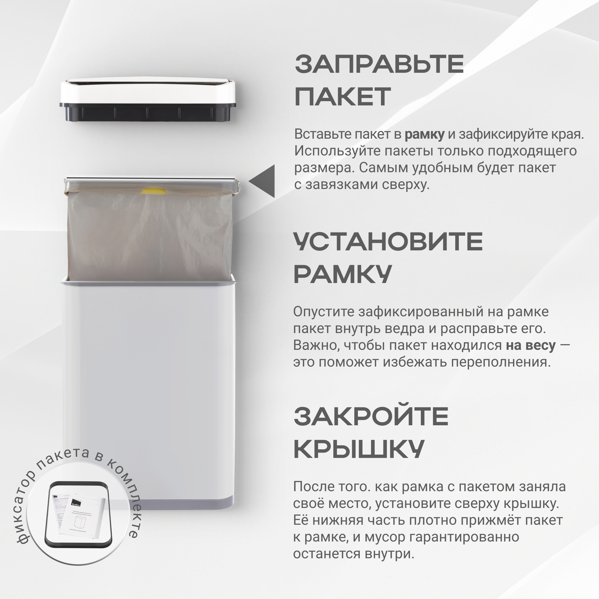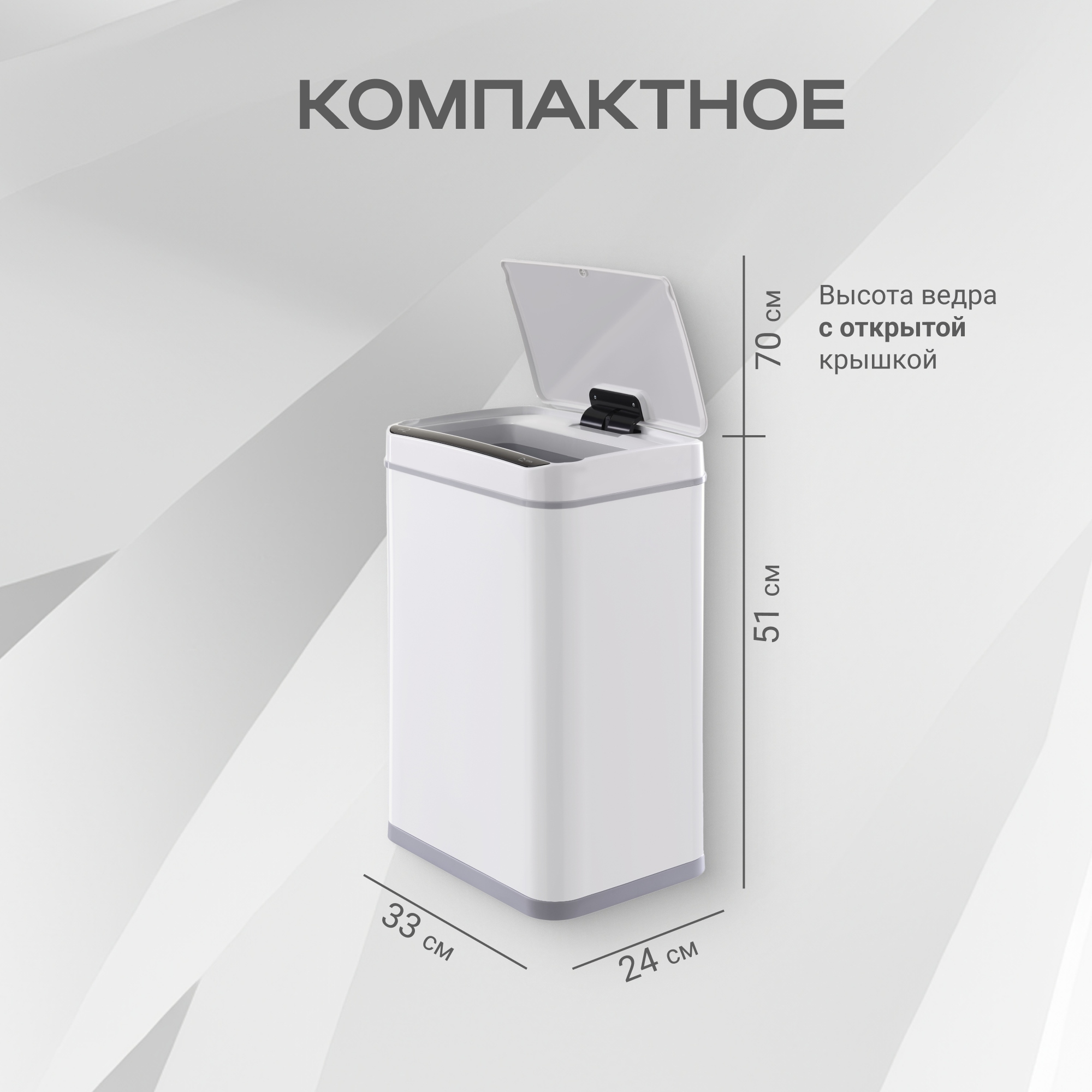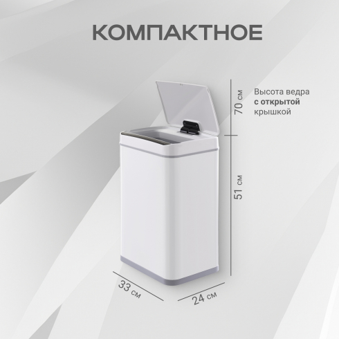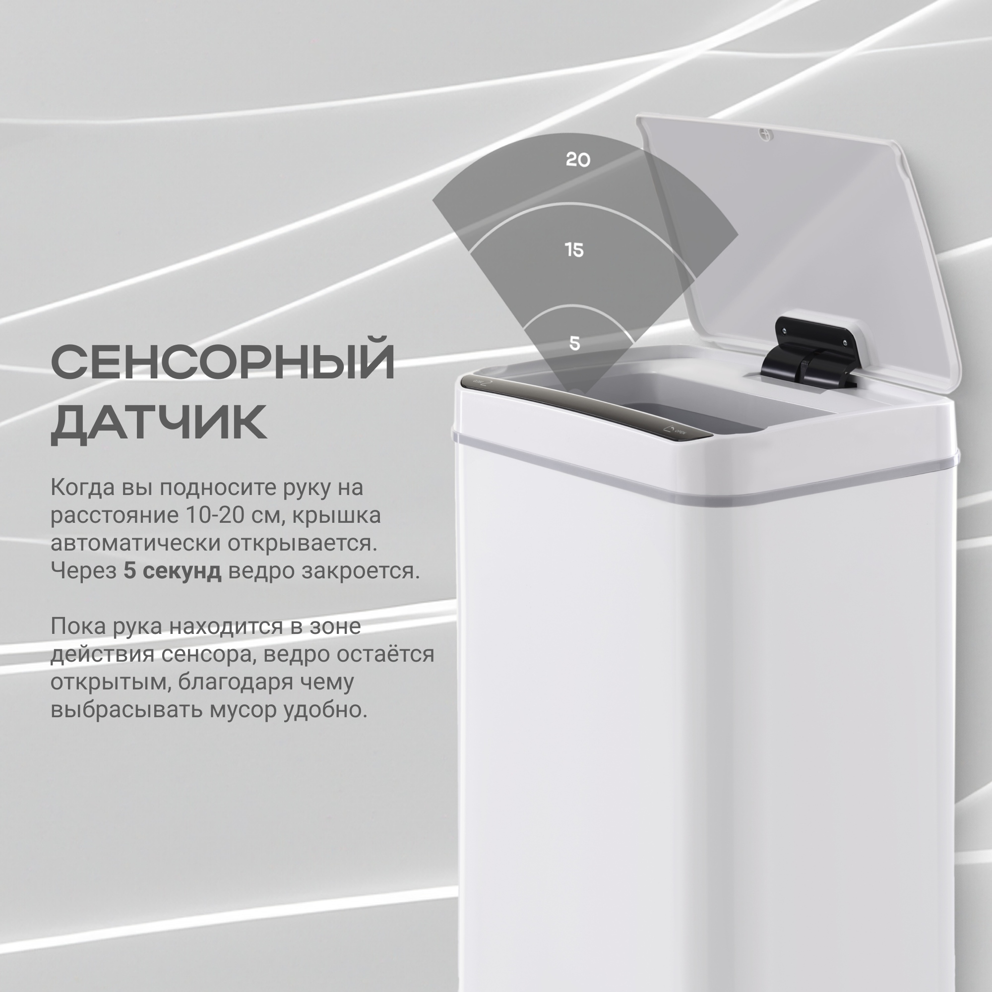 Отличительной особенностью таких урн является наличие сенсорного датчика, который самостоятельно открывает крышку мусоросборника при приближении пользователя к ней на расстояние 10-15 см. Теперь не нужно прикасаться к ведру, чтобы выкинуть мусор, и ваши руки останутся чистыми. Вы можете забыть о необходимости закрывать крышку - через 5 секунд она сама автоматически закроется.