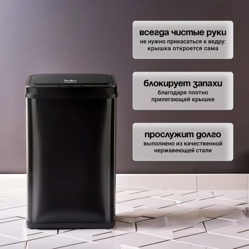 Больше никаких неприятных запахов: благодаря плотно прилегающей крышке содержимое внутри ведра изолировано. Бесконтактная работа делает прибор незаменимым везде, где есть необходимость утилизации отходов: дома, на даче, в офисе, магазине и других помещениях, таких как салоны красоты или медицинские центры. Индикаторы на дисплее позволят отслеживать актуальную информацию об устройстве, в том числе низкий уровень заряда батарей.