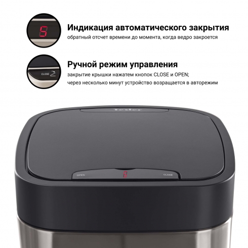 • Несколько режимов работы, в том числе ручной, который позволяет управлять открытием и закрытием крышки контейнера с помощью сенсорных кнопок, расположенных на фронтальной панели ведра.