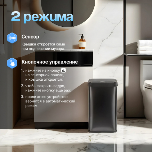 2 способа открытия крышки: бесконтактный и с помощью кнопок.