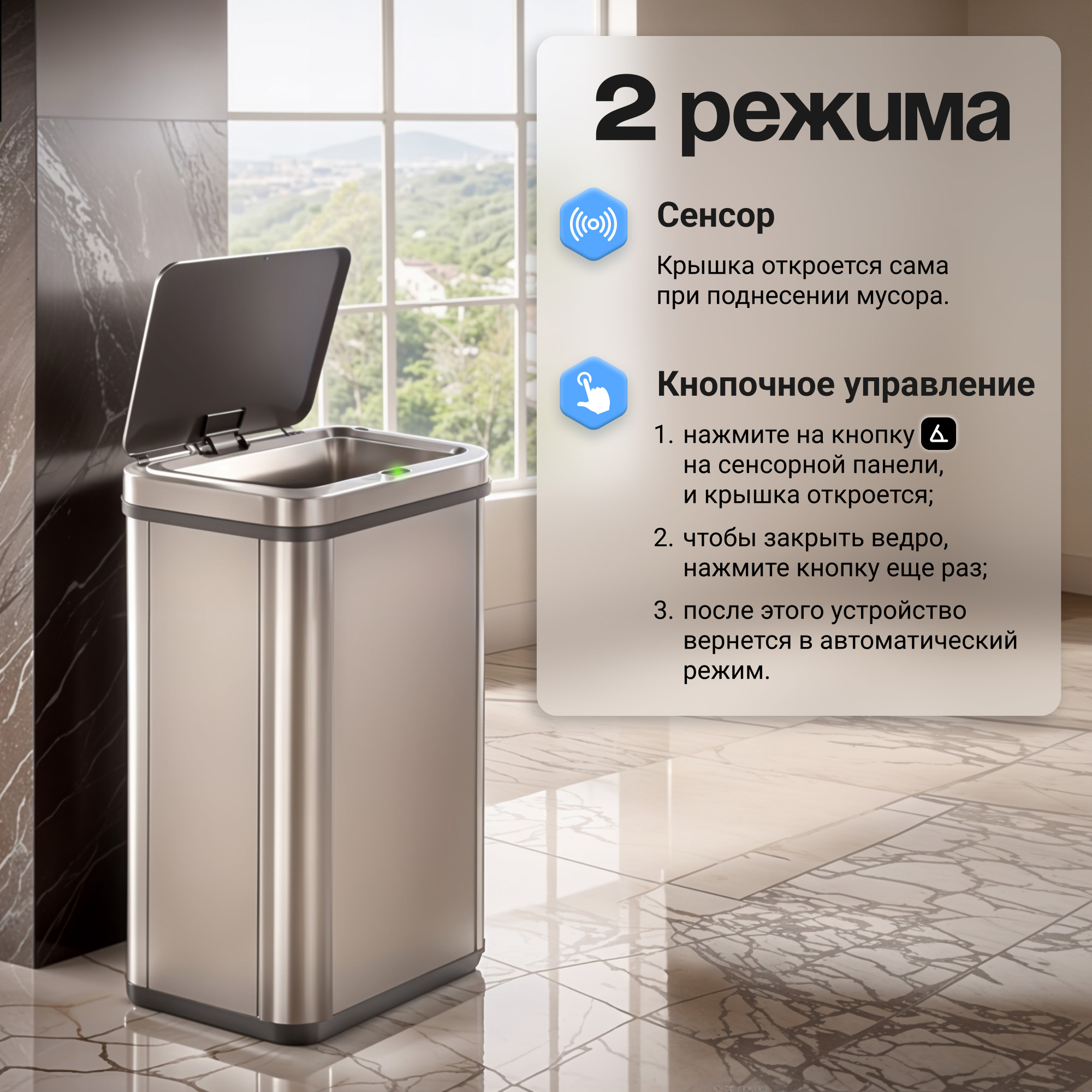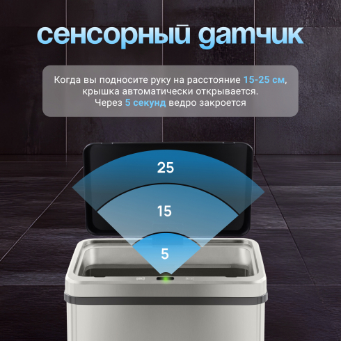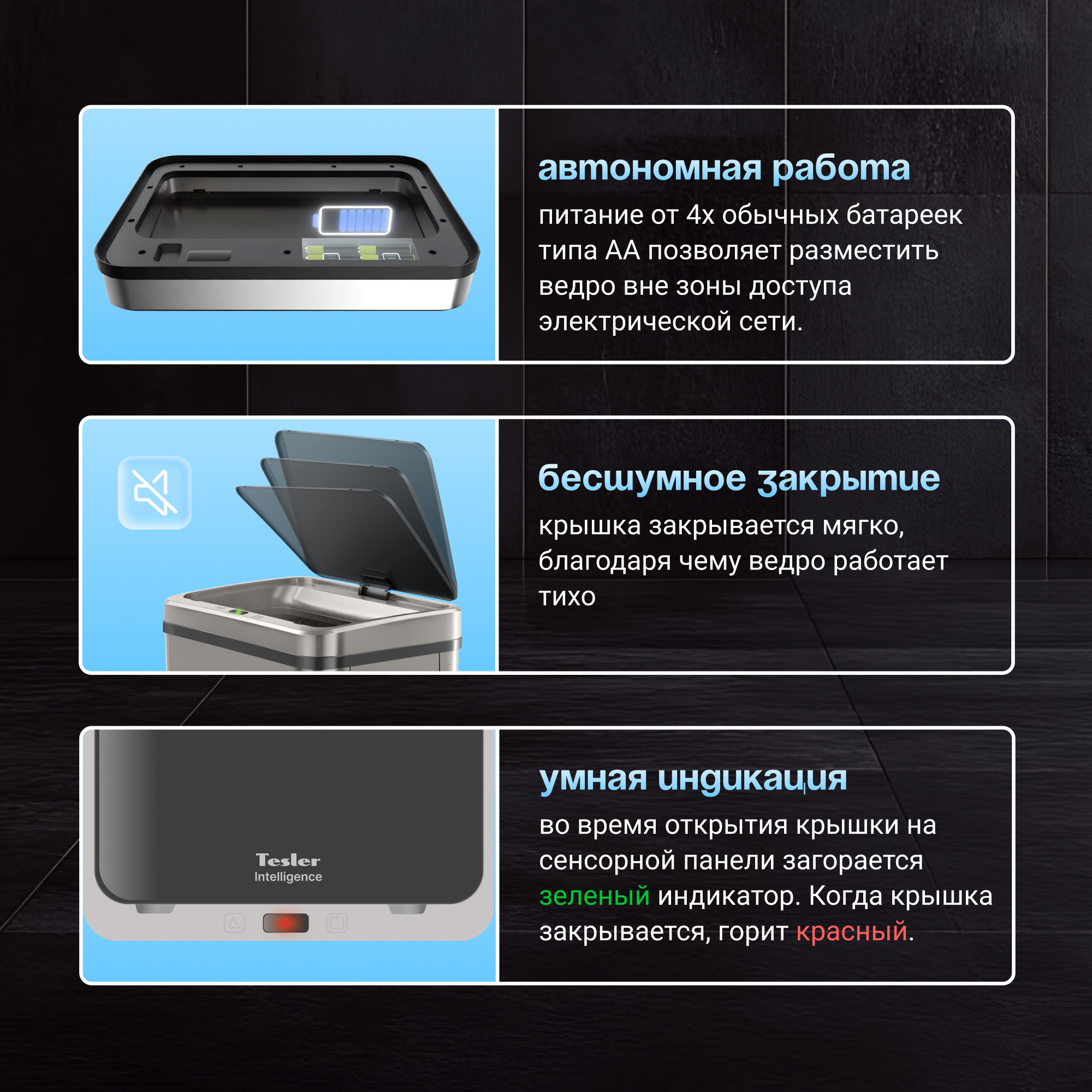 Умное ведро для мусора Tesler STB-50F – это простое и технологичное решение утилизации отходов. Сенсорный датчик самостоятельно открывает крышку при поднесении руки на расстояние 15-25 см от датчика. Больше не нужно прикасаться к ведру, чтобы выкинуть мусор, и ваши руки останутся чистыми. Крышка автоматически закроется сама через 5 секунд. Предусмотрен также ручной режим, в котором управлять открытием и закрытием крышки контейнера можно кнопкой, расположенной на фронтальной панели ведра. Питание осуществляется посредством 4-х батареек АА (не входят в комплект).