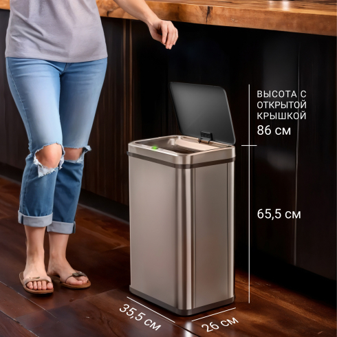 Больше никаких неприятных запахов: благодаря плотно прилегающей крышке содержимое внутри ведра изолировано. Бесконтактная работа делает прибор незаменимым везде, где есть необходимость утилизации отходов: дома, на даче, в офисе, магазине и других помещениях, таких как салоны красоты или медицинские центры. Индикаторы на дисплее позволят отслеживать актуальную информацию об устройстве, в том числе низкий уровень заряда батарей.