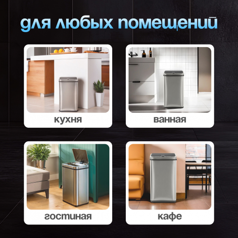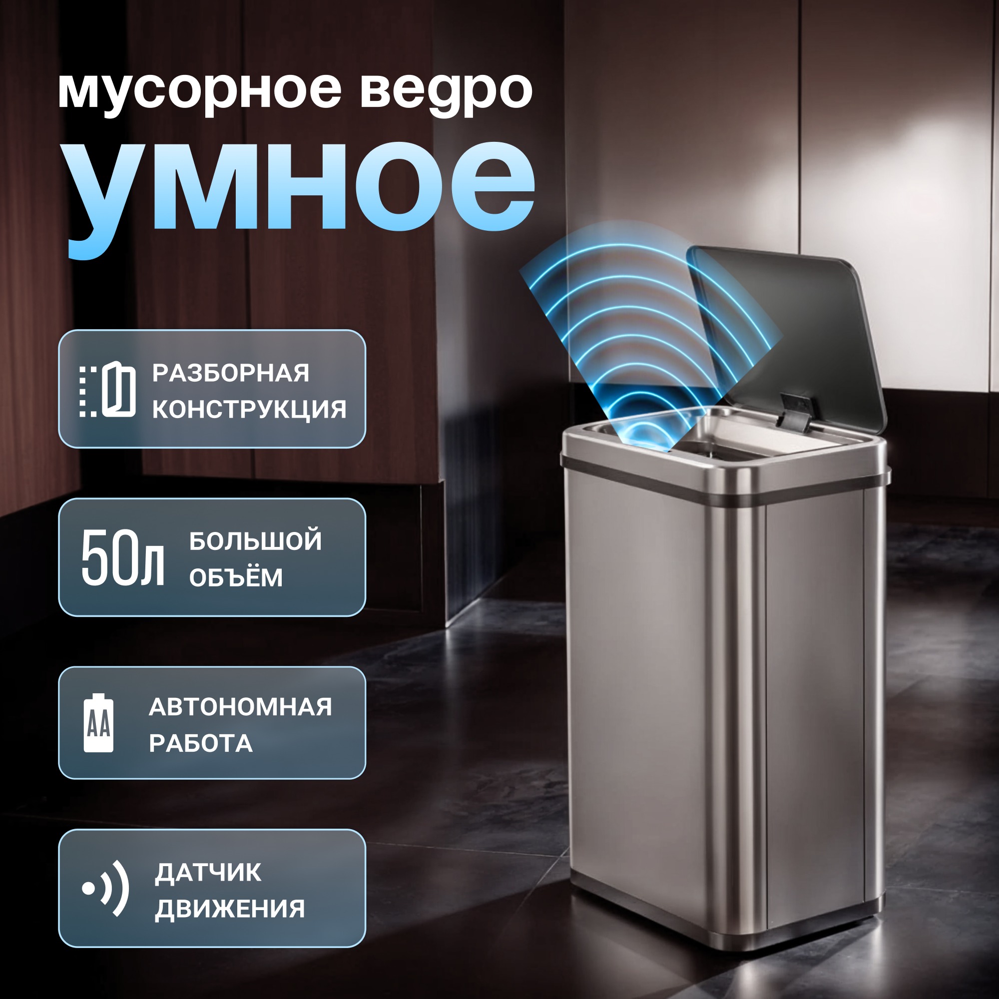 Простая прямоугольная форма удачно впишется в любой интерьер. Модель объемом 50 литров легко вмещает все отходы, которые накапливаются в течение дня у больших семей.