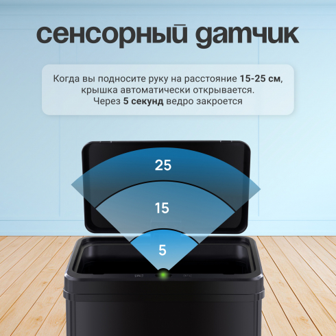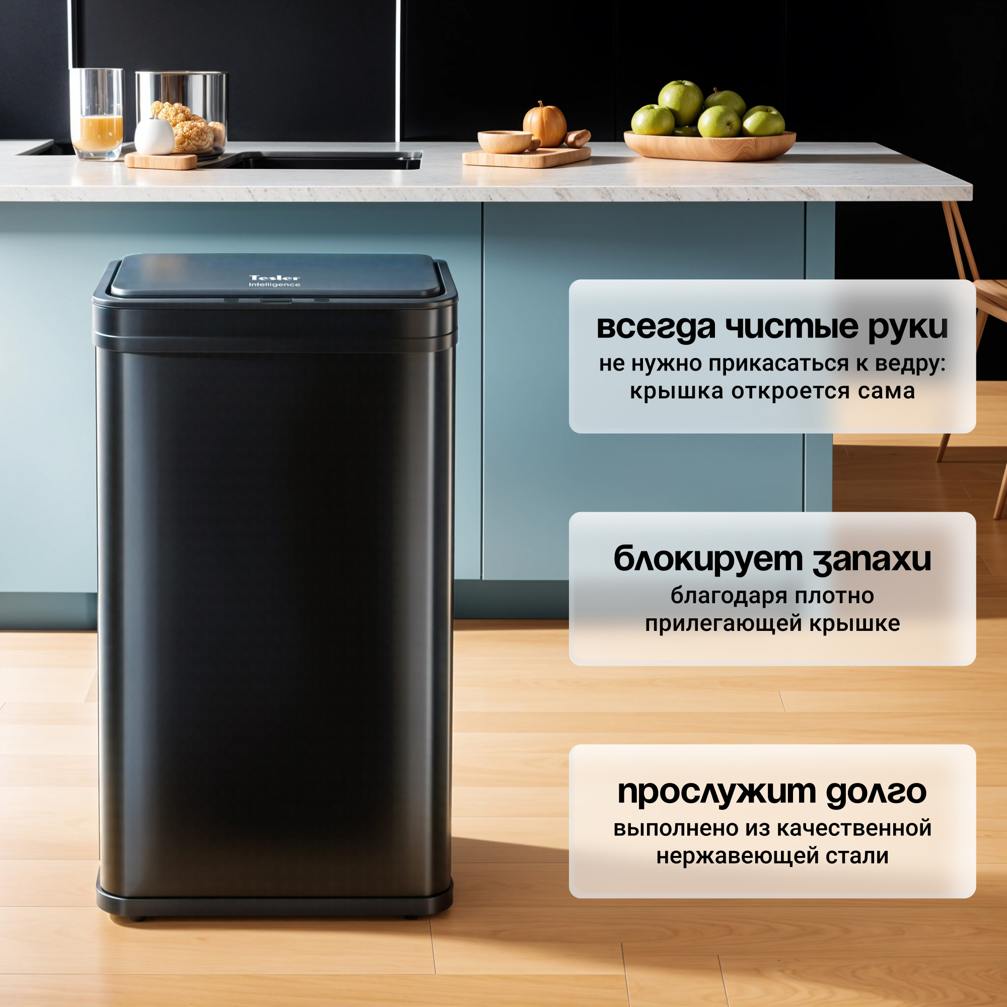 Умное ведро для мусора Tesler STB-60F – это простое и технологичное решение утилизации отходов. Сенсорный датчик самостоятельно открывает крышку при поднесении руки на расстояние 15-25 см от датчика. Больше не нужно прикасаться к ведру, чтобы выкинуть мусор, и ваши руки останутся чистыми. Крышка автоматически закроется сама через 5 секунд. Предусмотрен также ручной режим, в котором управлять открытием и закрытием крышки контейнера можно кнопкой, расположенной на фронтальной панели ведра. Питание осуществляется посредством 4-х батареек АА (не входят в комплект).