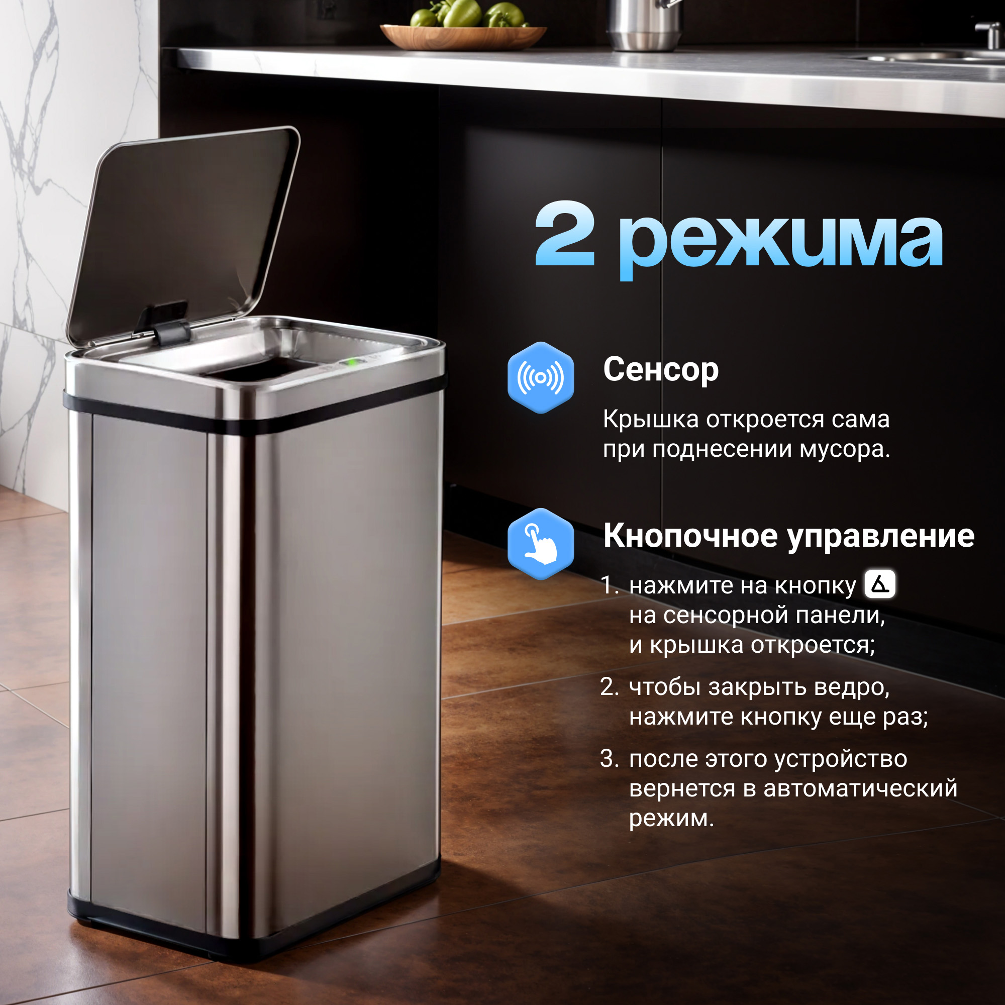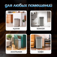 Простая прямоугольная форма удачно впишется в любой интерьер. Модель объемом 60 литров легко вмещает все отходы, которые накапливаются в течение дня у больших семей.