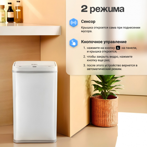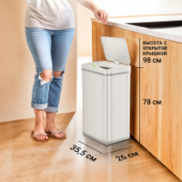 Больше никаких неприятных запахов: благодаря плотно прилегающей крышке содержимое внутри ведра изолировано. Бесконтактная работа делает прибор незаменимым везде, где есть необходимость утилизации отходов: дома, на даче, в офисе, магазине и других помещениях, таких как салоны красоты или медицинские центры. Индикаторы на дисплее позволят отслеживать актуальную информацию об устройстве, в том числе низкий уровень заряда батарей.