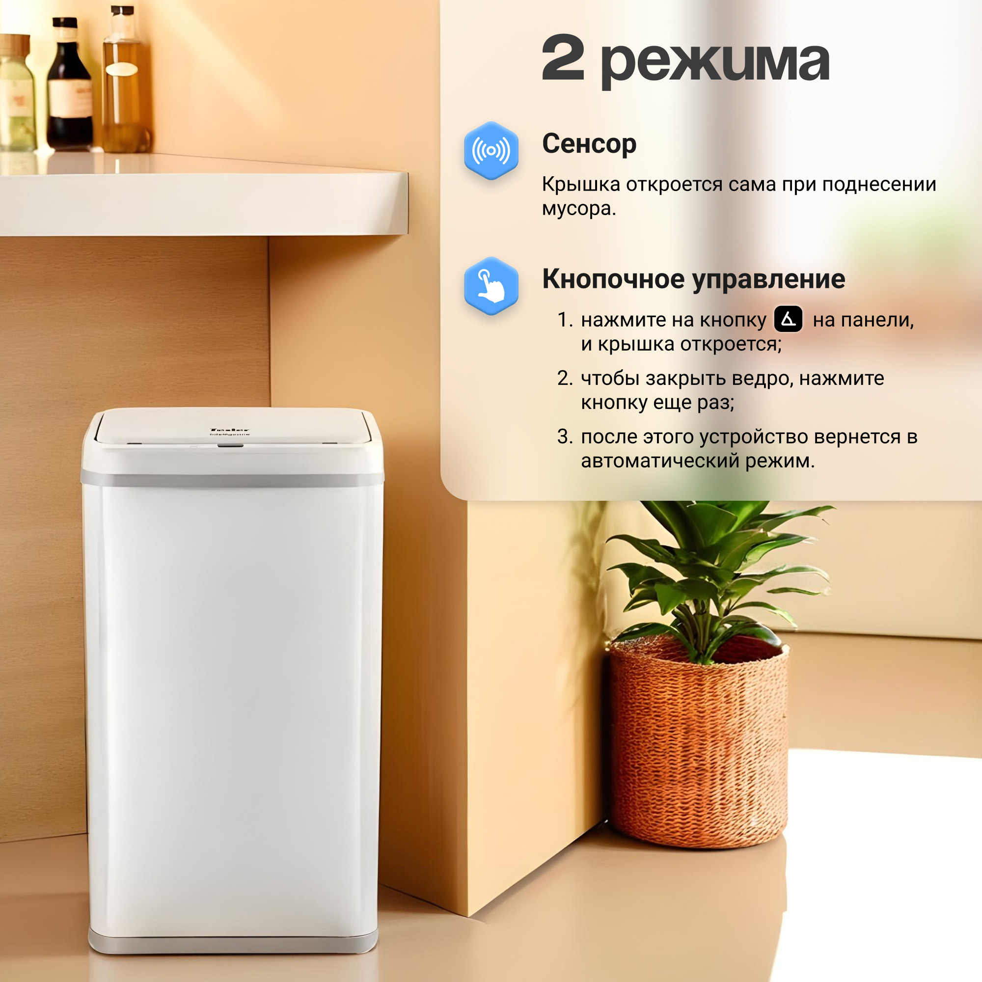 Умное ведро для мусора Tesler STB-60F – это простое и технологичное решение утилизации отходов. Сенсорный датчик самостоятельно открывает крышку при поднесении руки на расстояние 15-25 см от датчика. Больше не нужно прикасаться к ведру, чтобы выкинуть мусор, и ваши руки останутся чистыми. Крышка автоматически закроется сама через 5 секунд. Предусмотрен также ручной режим, в котором управлять открытием и закрытием крышки контейнера можно кнопкой, расположенной на фронтальной панели ведра. Питание осуществляется посредством 4-х батареек АА (не входят в комплект).