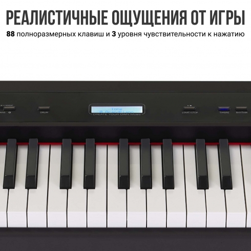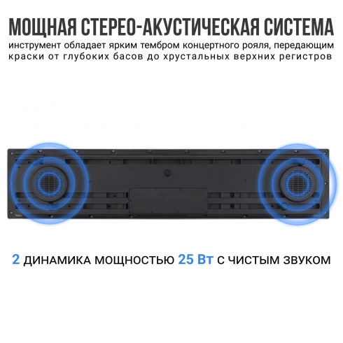 Полноразмерная градуированная молоточковая клавиатура дает реалистичные ощущения как при игре на акустическом инструменте за счет использования пружинно-рычажной системы клавишного механизма. Клавиши в нижнем регистре нажимаются немного тяжелее, а в верхнем регистре – легче, что помогает воспроизводить все нюансы тембров с глубокой градацией звуковой окраски, зависящей от силы удара.