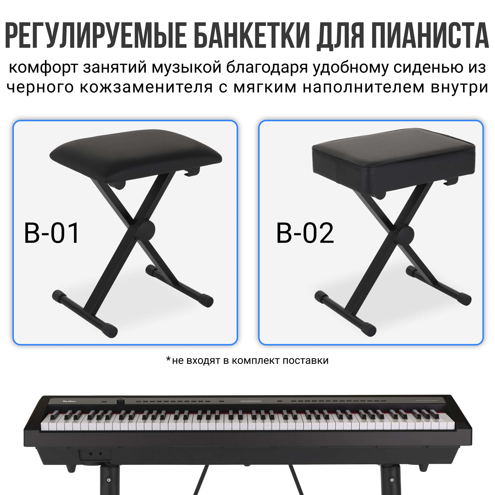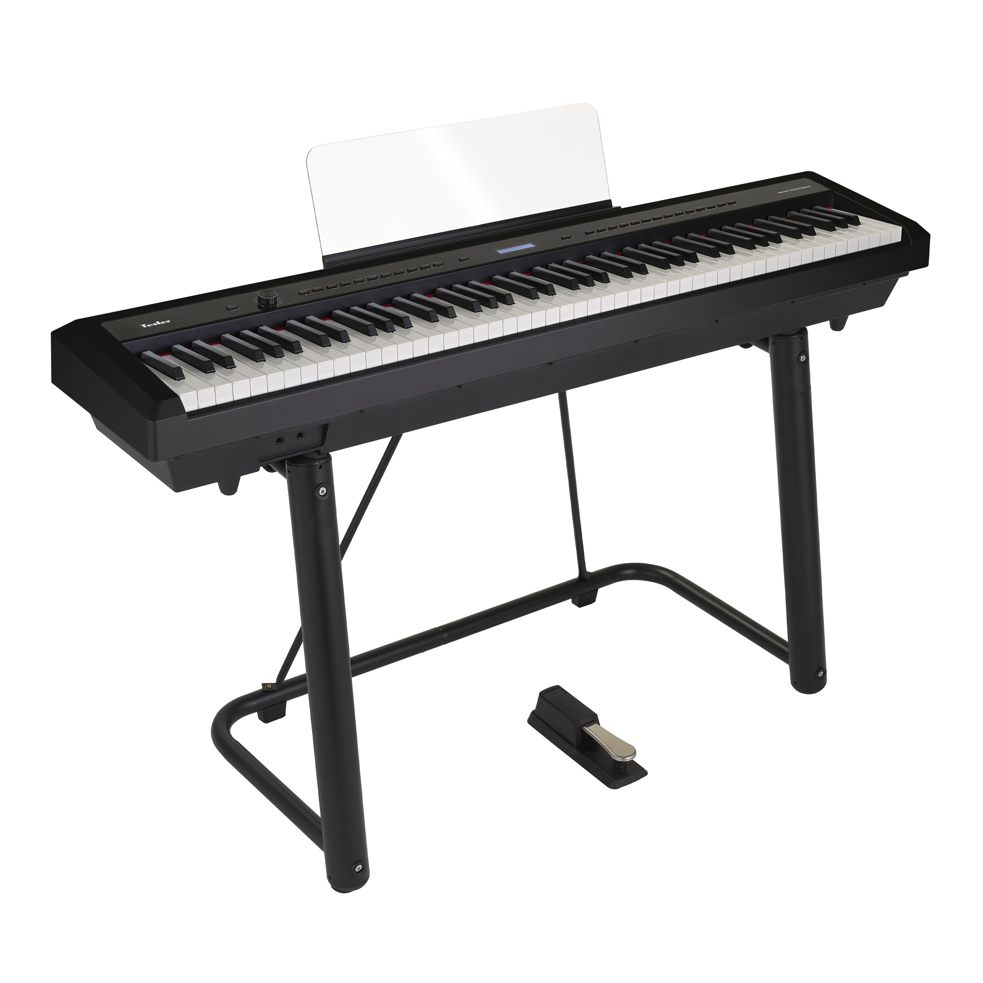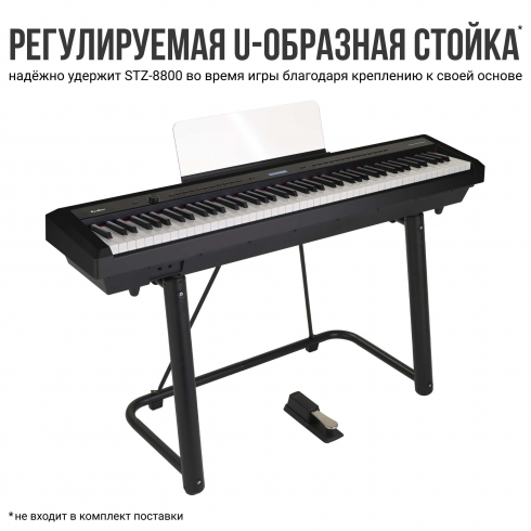 Вы также можете дополнительно приобрести металлическую подставку под данный инструмент – Tesler U-Type. Она надёжно удержит пианино во время игры благодаря креплению устройства к своей основе. Прорезиненные держатели защищают корпус, а резиновые накладки на ножки обеспечивают устойчивость.