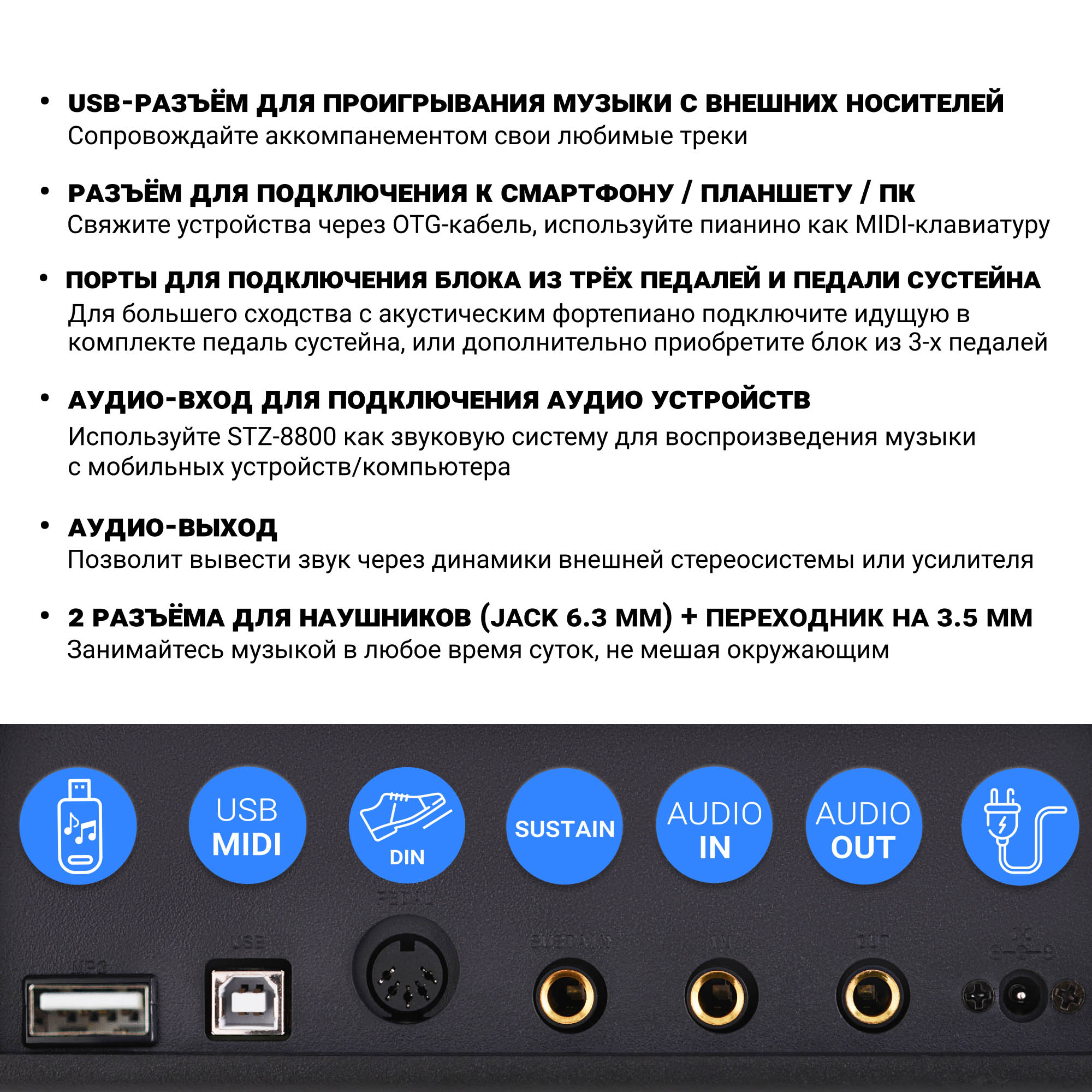 Разъемы: USB (flash), USB-MIDI, разъем для подключения педали, аудио вход, аудио выход, выход на наушники, разъем подключения питания (12В, 3А).