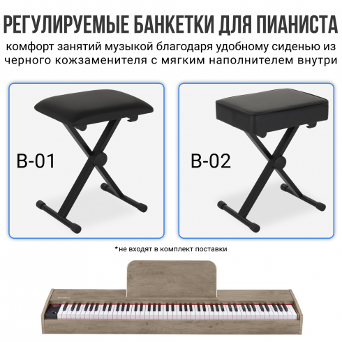 Вы также можете дополнительно приобрести подставку под данный инструмент – ST-8805. Она надёжно удерживает пианино во время игры благодаря креплению музыкального инструмента к своей основе. При установке цифрового пианино на данную подставку инструмент будет иметь ту же высоту клавиш, что и акустическое фортепиано, что подарит исполнителю комфорт при занятиях музыкой.