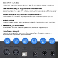 Разъемы: AUDIO IN / OUT разъемы, MIDI IN / OUT разъемы, USB разъем для подключения к компьютеру для использования музыкального ПО, 2 разъема для подключения наушников, разъем для подключения педалей.