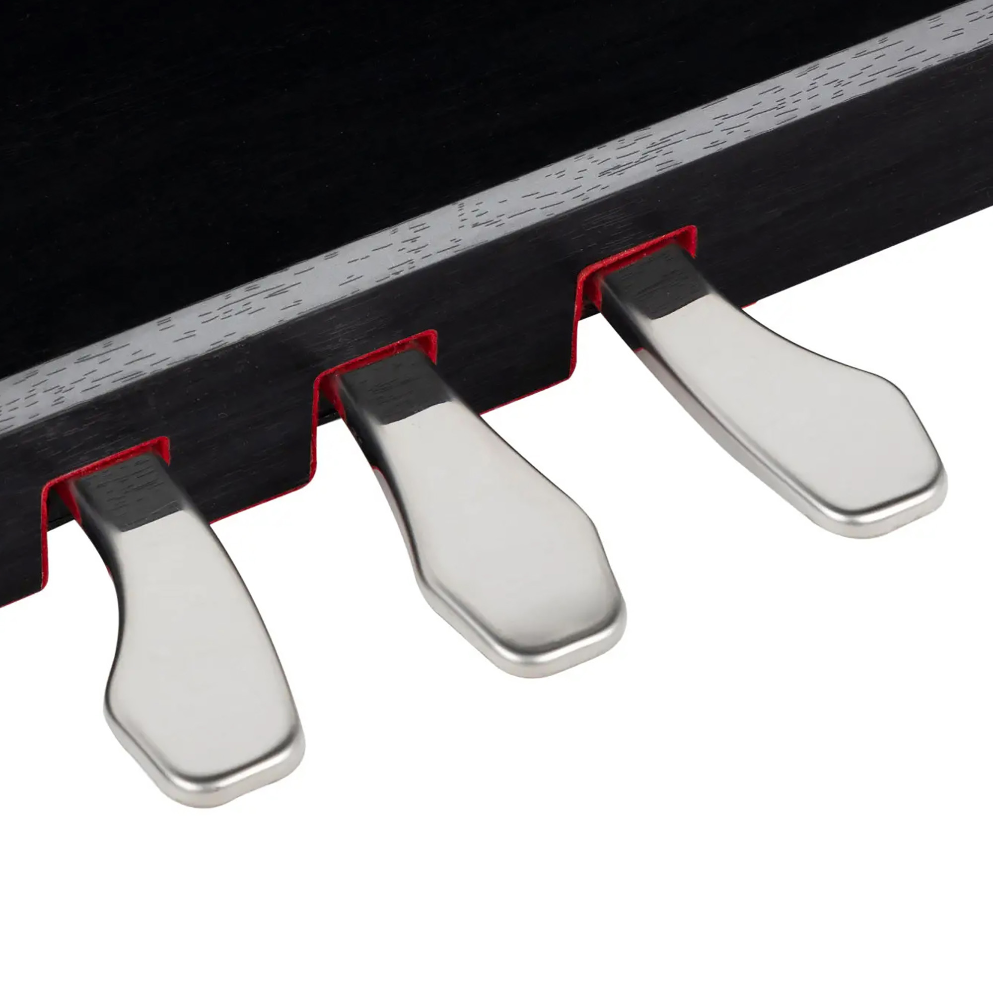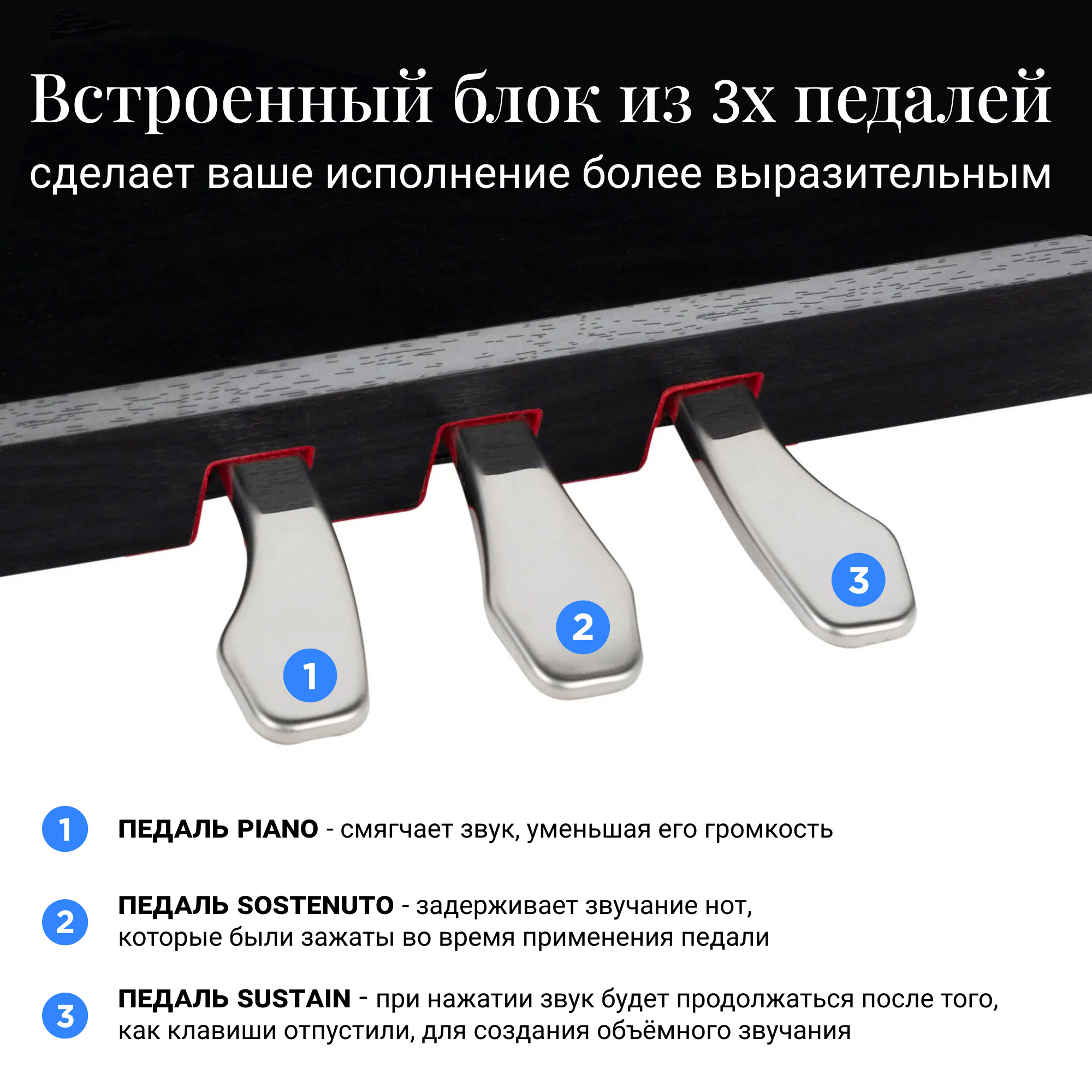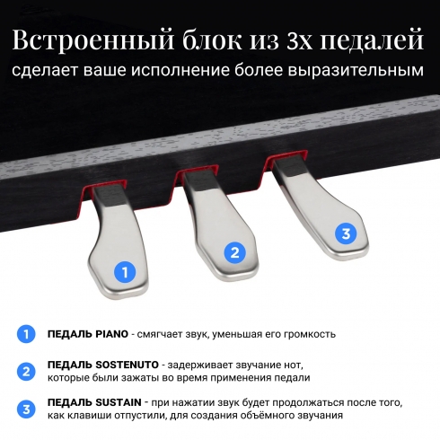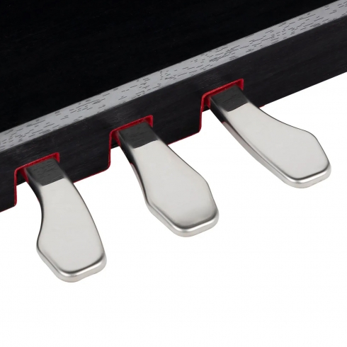 Для большей выразительности при исполнении, и сходства с акустическим фортепиано в данной модели цифрового пианино предусмотрено 3 педали. Педаль сустейна (правая) - при нажатии звук будет продолжаться после того, как клавиши отпустили, для создания объёмного звучания. Нажатие педаль пиано (левая) смягчает звук, уменьшая его громкость. После нажатия задерживающей педали (средняя) задержится звучание только тех нот, которые были зажаты во время применения педали.