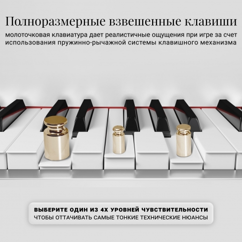 Полноразмерная молоточковая клавиатура дает реалистичные ощущения как при игре на акустическом инструменте за счет использования пружинно-рычажной системы клавишного механизма. Клавиши в нижнем регистре нажимаются немного тяжелее, а в верхнем регистре – легче, что помогает воспроизводить все нюансы тембров с глубокой градацией звуковой окраски, зависящей от силы удара.