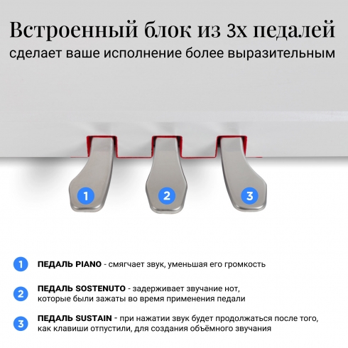 Для большей выразительности при исполнении, и сходства с акустическим фортепиано в данной модели цифрового пианино предусмотрено 3 педали. Педаль сустейна (правая) - при нажатии звук будет продолжаться после того, как клавиши отпустили, для создания объёмного звучания. Нажатие педаль пиано (левая) смягчает звук, уменьшая его громкость. После нажатия задерживающей педали (средняя) задержится звучание только тех нот, которые были зажаты во время применения педали.