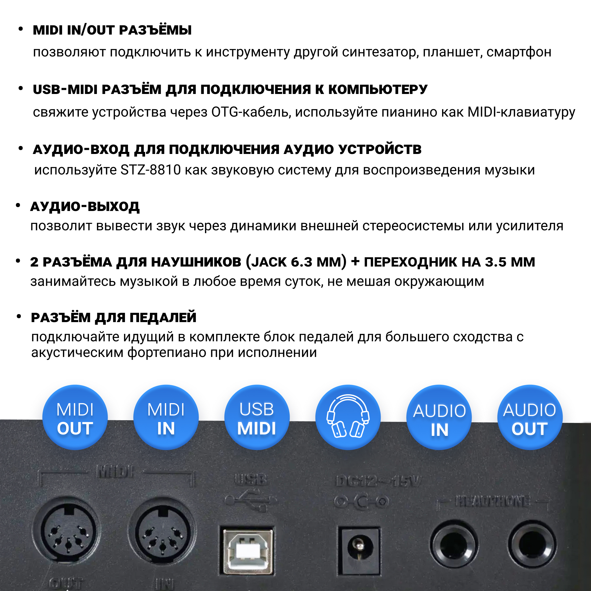 Tesler STZ-8810 — отличный вариант для тех, кто ценит качественный звук и функционал. Инструмент обладает ярким тембром концертного рояля, передающим краски от глубоких басов до хрустальных верхних регистров благодаря мощной стерео-акустической системе.