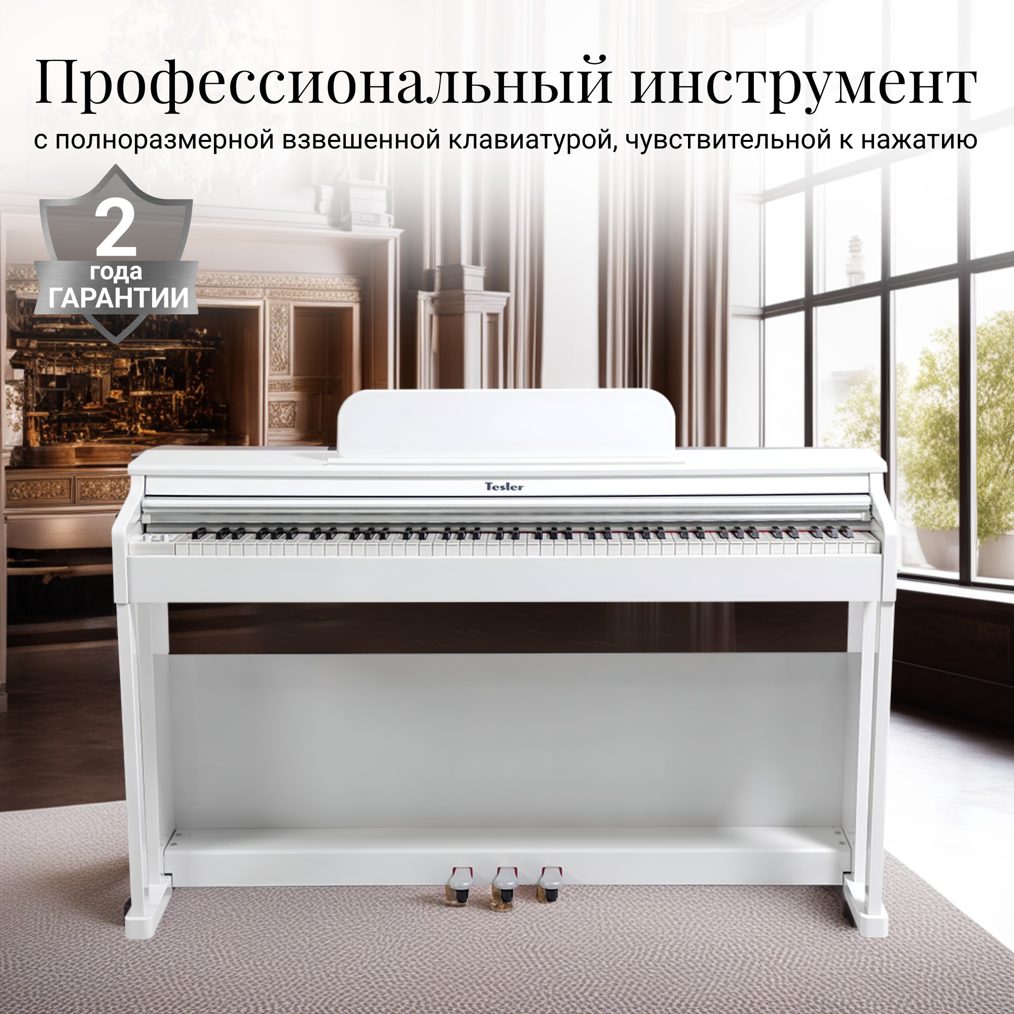 Цифровое пианино в стационарном деревянном корпусе Tesler STZ-8810 — отличный выбор для тех, кто ценит высокое качество звука, стильный дизайн и широкий функционал. В комплекте идет надёжная стойка, имеющая ту же высоту клавиш, что и акустический инструмент. Стойка обеспечивает устойчивость инструмента во время игры и проста в сборке. Лакированная поверхность стойки STZ-8810 ROYAL WHITE защищена от выцветания, что способствует сохранению качества и внешнего вида инструмента на протяжении многих лет.