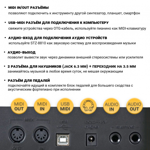 Разъемы: AUDIO IN / OUT разъемы, MIDI IN / OUT разъемы, USB разъем для подключения к компьютеру для использования музыкального ПО, 2 разъема для подключения наушников, разъем для подключения педалей.