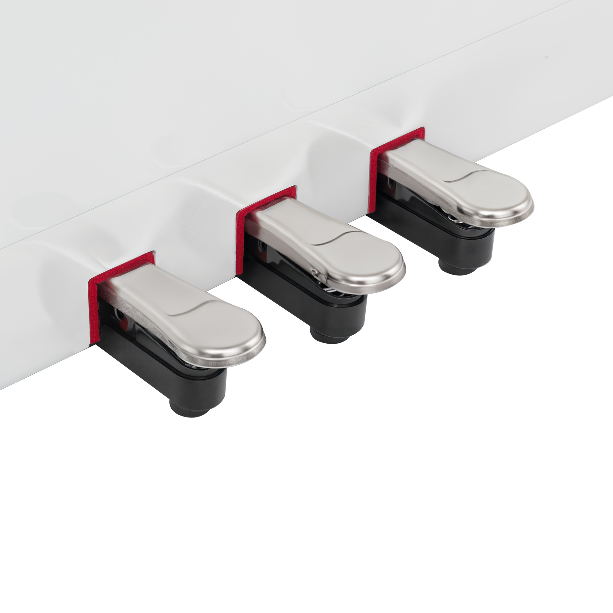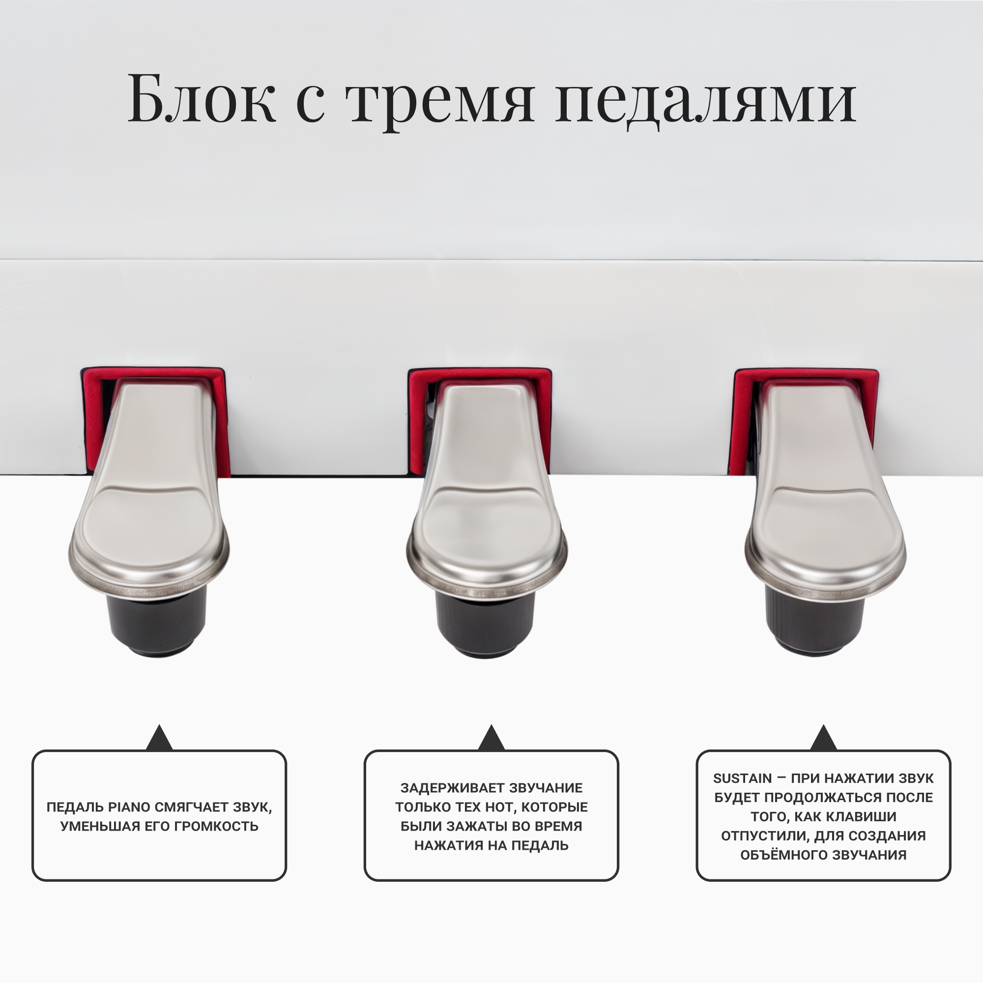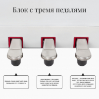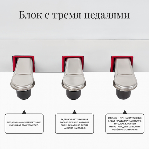 Для большей выразительности при исполнении, и сходства с акустическим фортепиано в данной модели цифрового пианино предусмотрено 3 педали. Педаль сустейна (правая) - при нажатии звук будет продолжаться после того, как клавиши отпустили, для создания объёмного звучания. Нажатие на педаль пиано (левая) смягчает звук, уменьшая его громкость. После нажатия задерживающей педали (средняя) задержится звучание только тех нот, которые были зажаты во время применения педали.