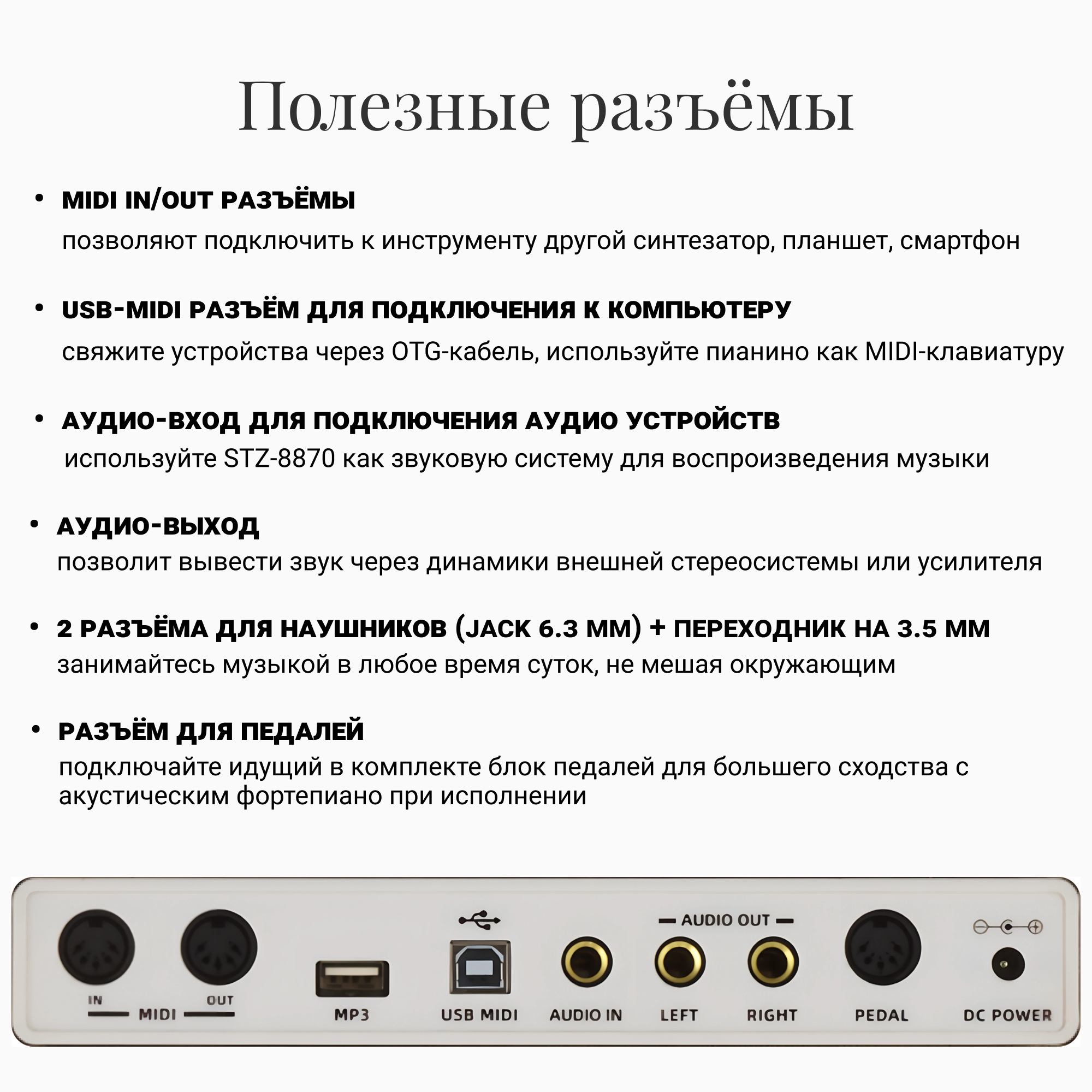 Разъемы: AUDIO IN / OUT разъемы, MIDI IN / OUT разъемы, USB разъем для подключения к компьютеру для использования музыкального ПО, 2 разъема для подключения наушников, разъем для подключения педалей.