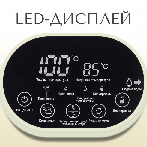 Информативный дисплей покажет вам не только заданный режим, но и температуру в режиме реального времени. Когда вода внутри колбы будет заканчиваться – загорится соответствующий индикатор на дисплее.