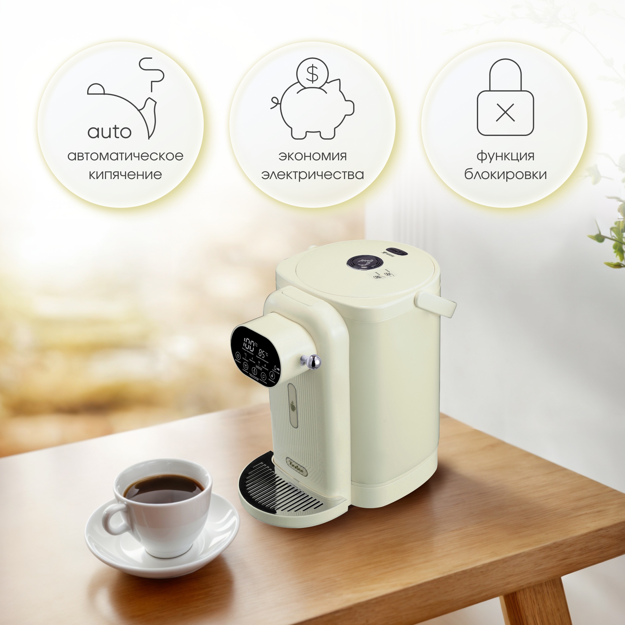 Пользоваться термопотом легко: снимите блокировку подачи воды, а затем опустите рычаг. Как только ваша кружка будет полностью наполнена, просто отпустите рычаг, чтобы остановить поток воды. Все материалы, контактирующие с водой, абсолютно безопасны и экологичны. На внутреннюю колбу из нержавеющей стали нанесено покрытие, препятствующее образованию накипи и ржавчины. Теперь даже при использовании водопроводной воды колбу легко очистить, а съёмная крышка термопота сделает этот процесс еще более удобным.